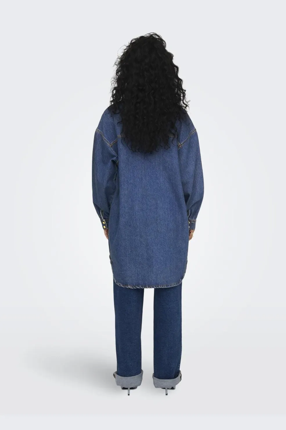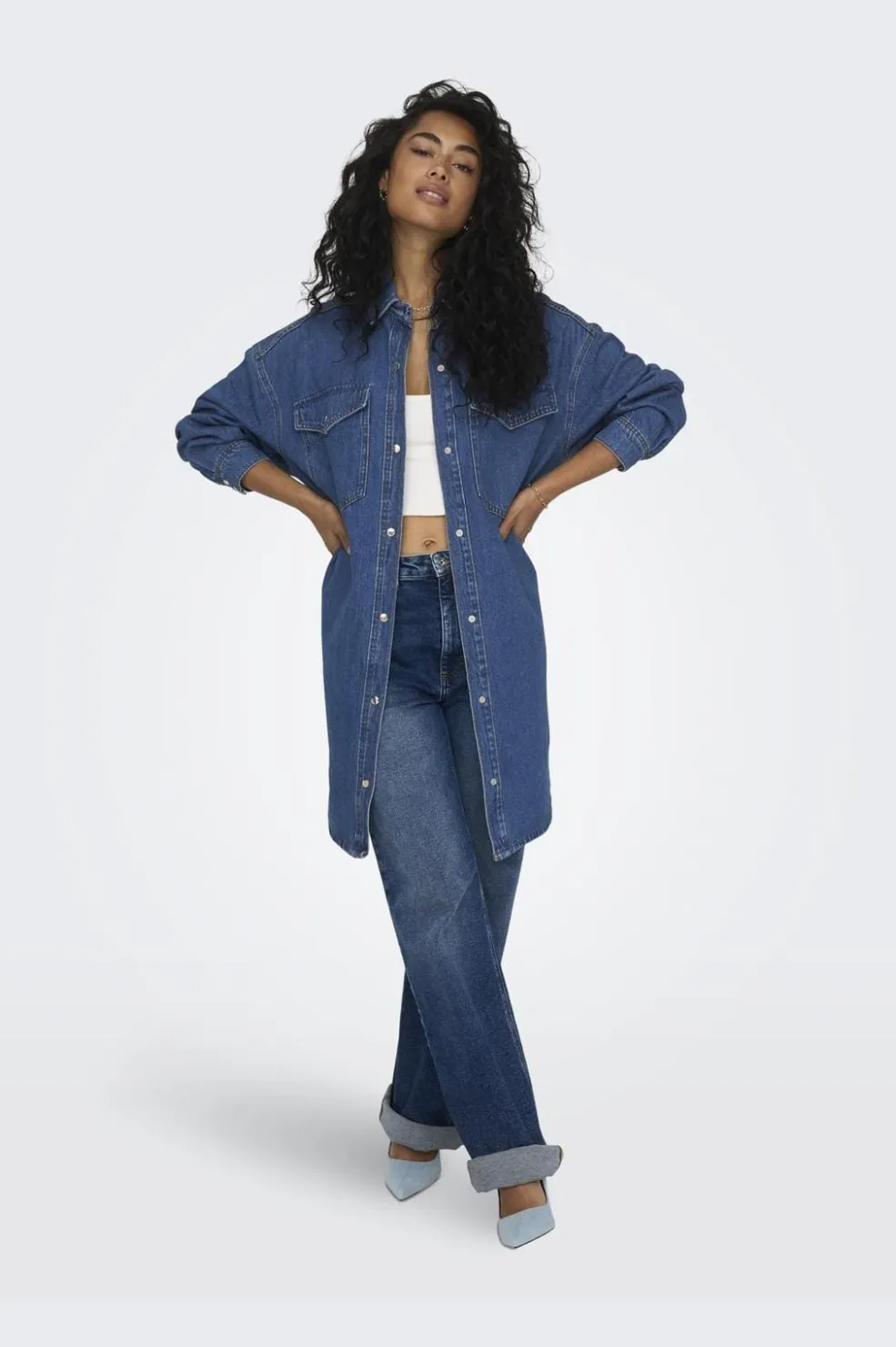 Denimkjole fra Only i medium blå denim. Kjolen har en skjortekrave, knaplukning foran og to brystlommer. Den oversized pasform giver en afslappet stil.