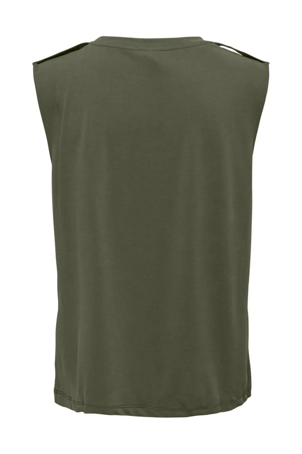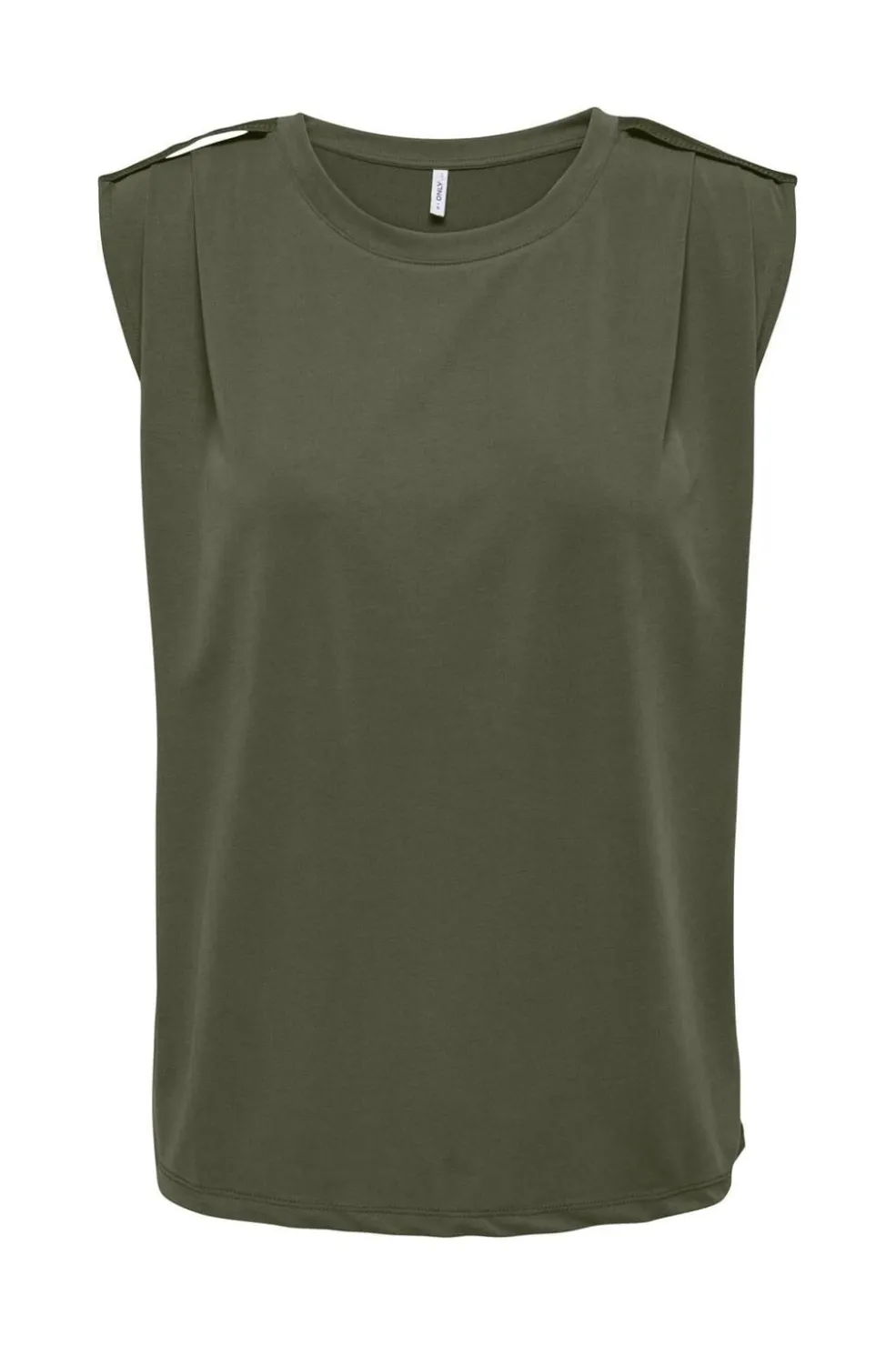 Ærmeløs top fra Only i mørkegrøn Kalamata-farve. Toppen har en rund halsudskæring og flæsedetaljer ved skuldrene. Den er lavet i en blanding af modal og polyester med et smukt fald.