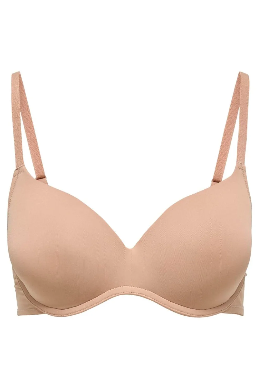 Beige bh fra Only med formstøbte skåle. Bh’en har smalle, justerbare skulderstropper og en klassisk hægte- og øjelukning på bagsiden.