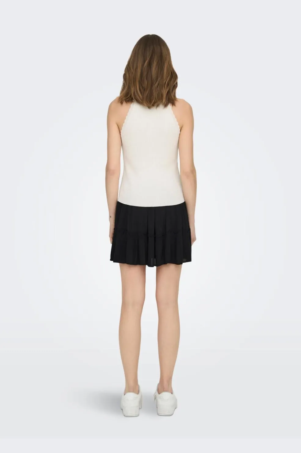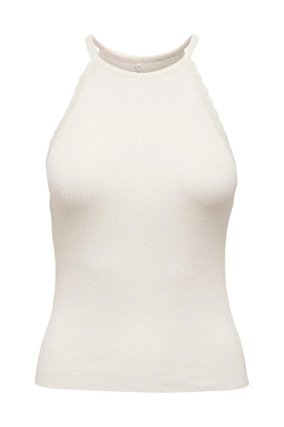 Strikket top fra Only i cremehvid Cloud Dancer-farve. Toppen har en ribbet tekstur og et halterneck-design med bølgede kanter. Den ærmeløse model har en lige pasform.
