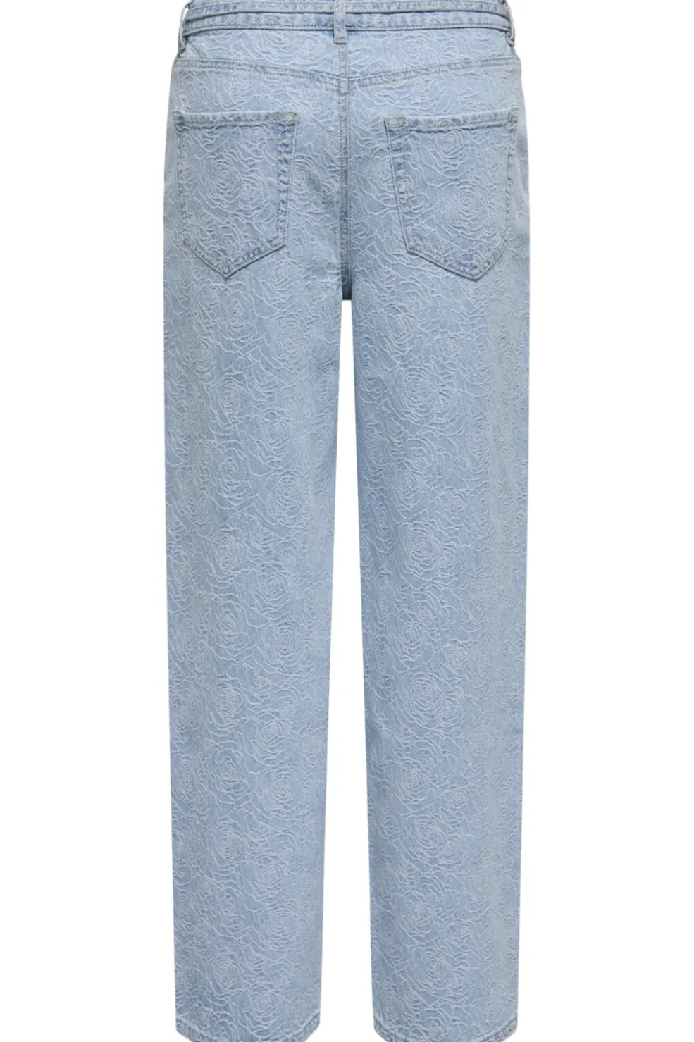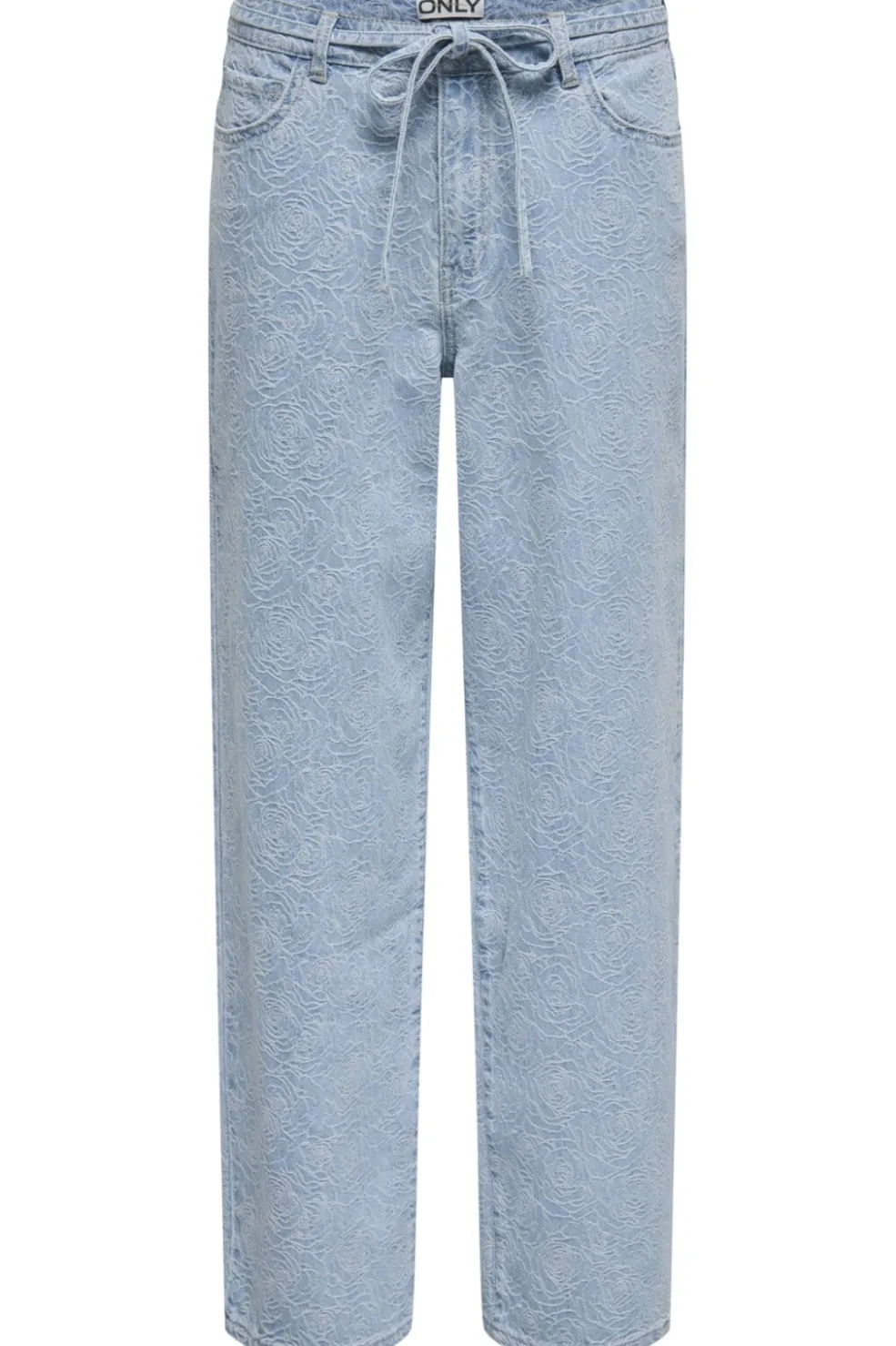 Lyseblå denimjeans fra Only med indvævet blomstermønster. Bukserne har en lige pasform og ankellængde med snøre og lynlås i taljen.