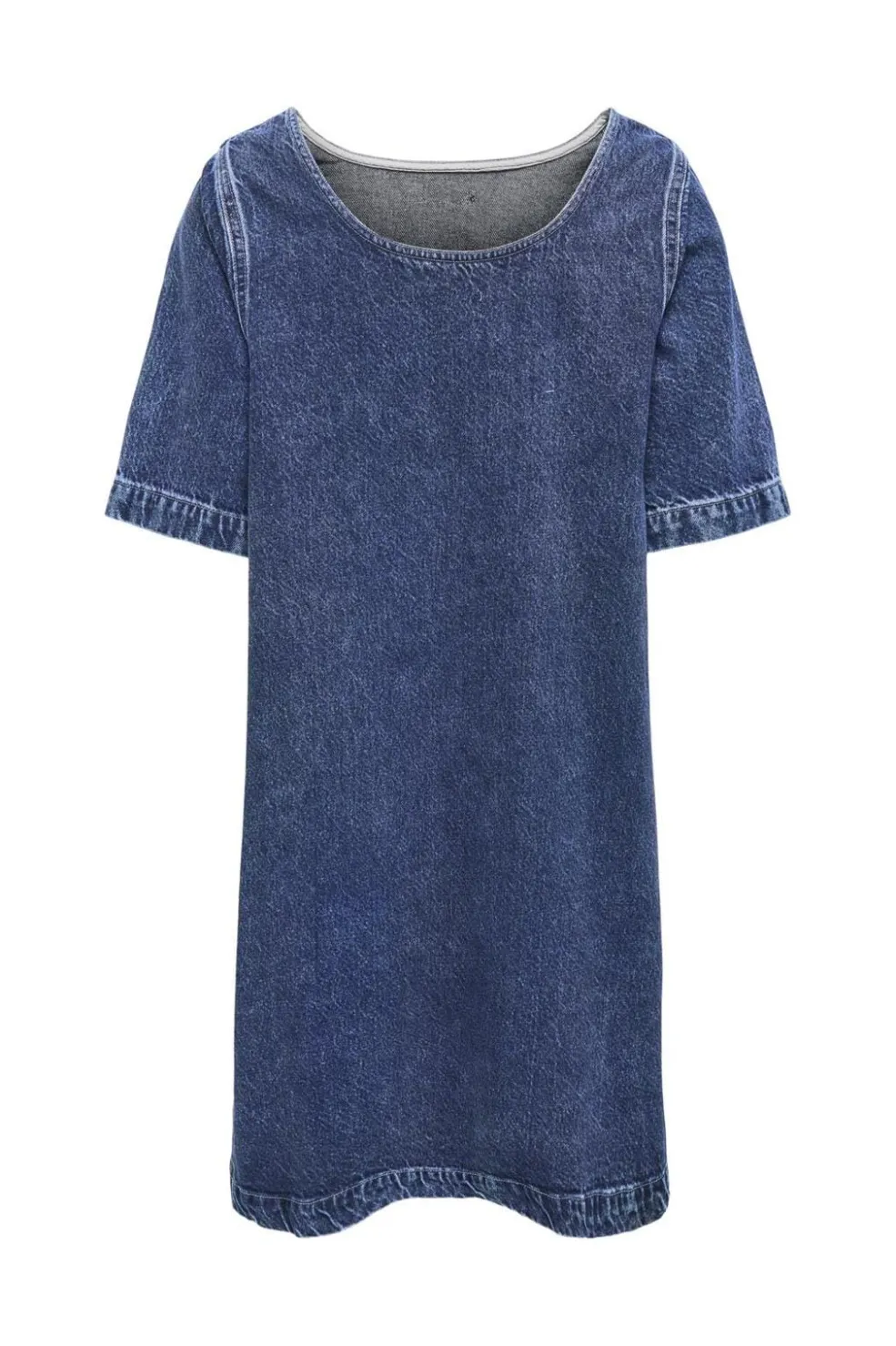 Denimkjole fra Only i medium blå. Kjolen har en A-formet silhuet med rund halsudskæring og korte ærmer. Dekorative syninger fremhæver det klassiske denimudtryk.