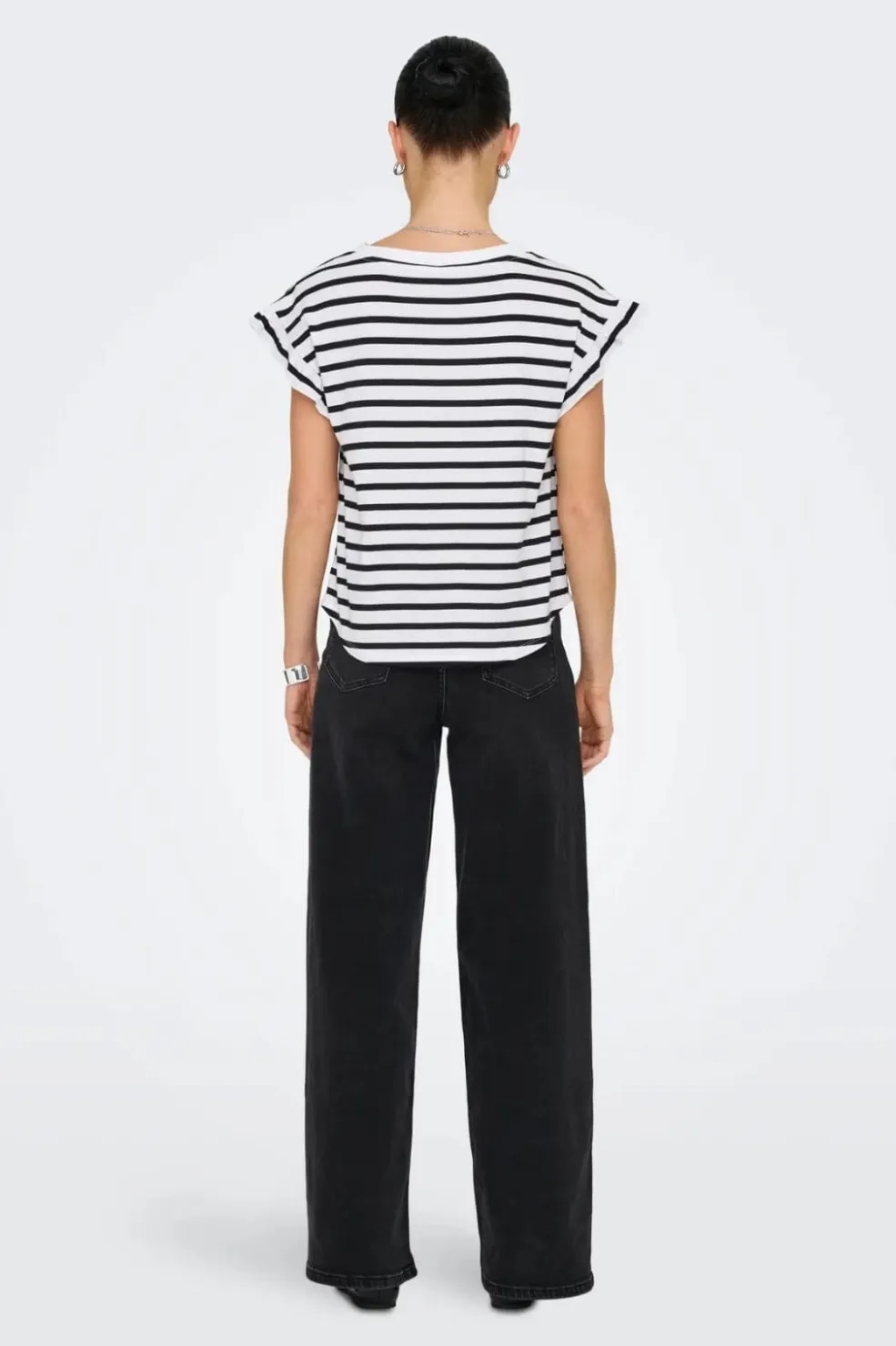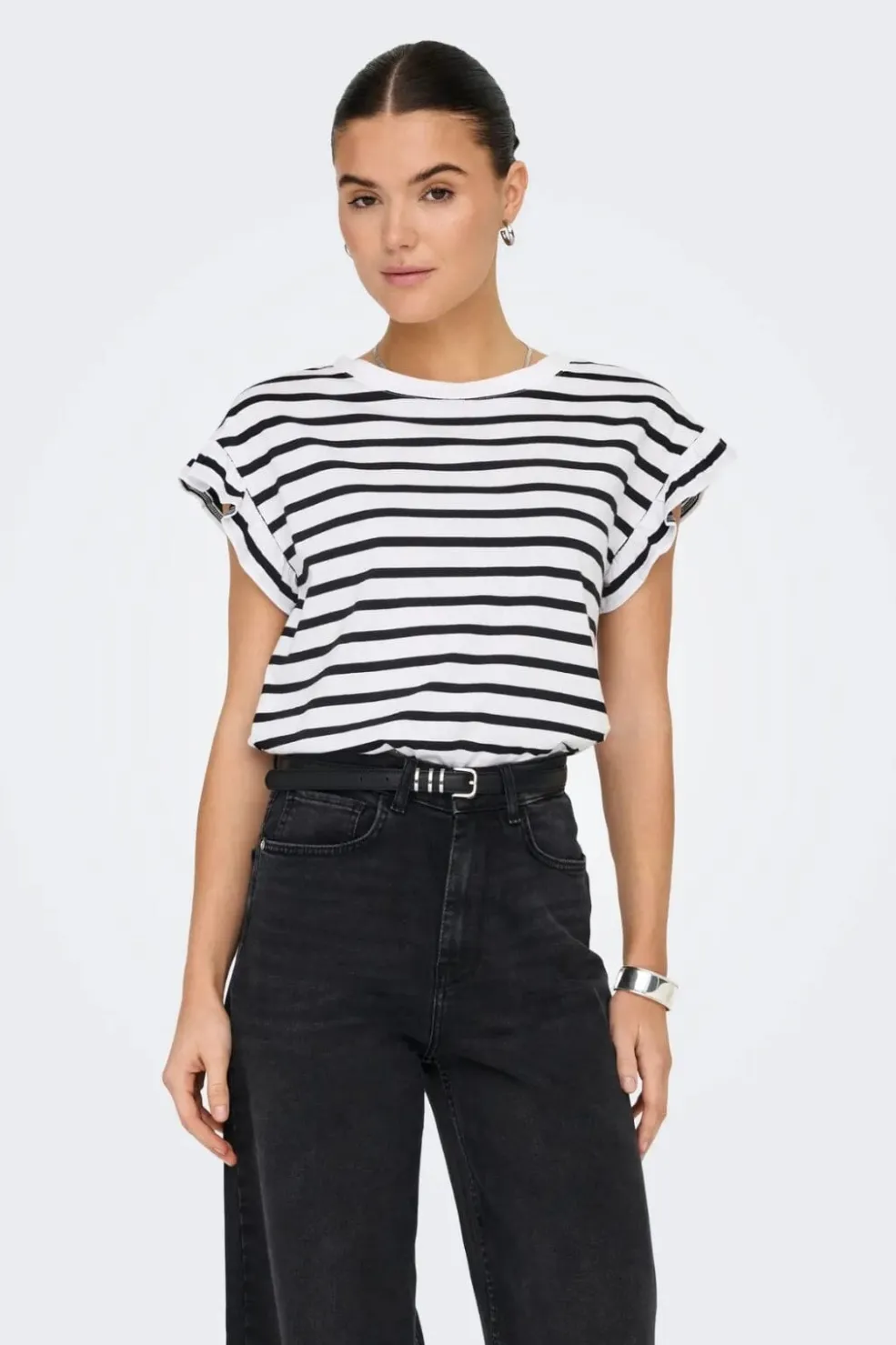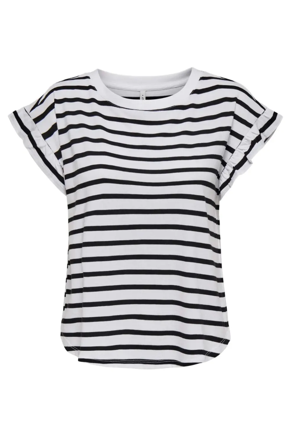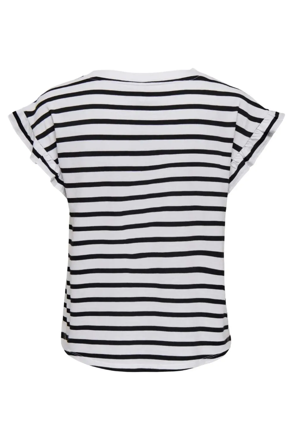 Stribet top fra Only med korte ærmer og rund halsudskæring. Toppen har flæsedetaljer på ærmerne og vandrette striber i sort og hvid. Den kommer i en regular fit.