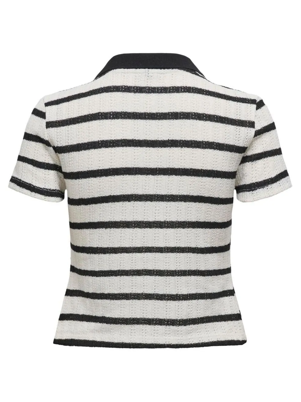 Kortærmet polotop fra Only med sort-hvide striber. Toppen har en klassisk polokrave og dekorative syninger, der giver struktur til designet. Den hvide bundfarve med sorte striber skaber et maritimt udtryk.