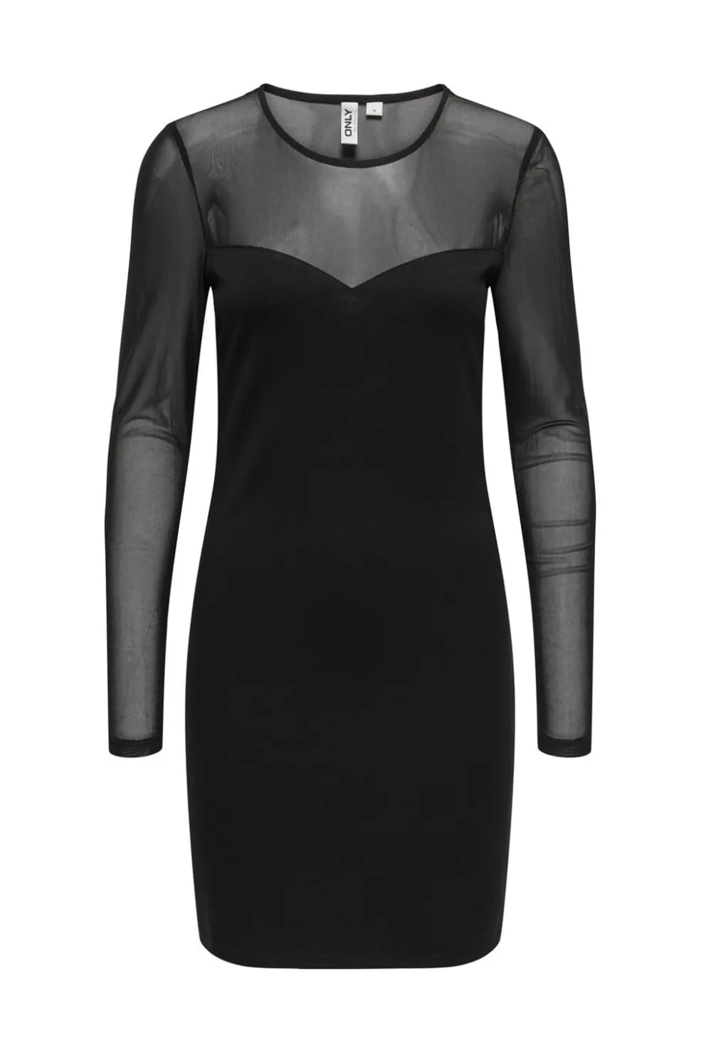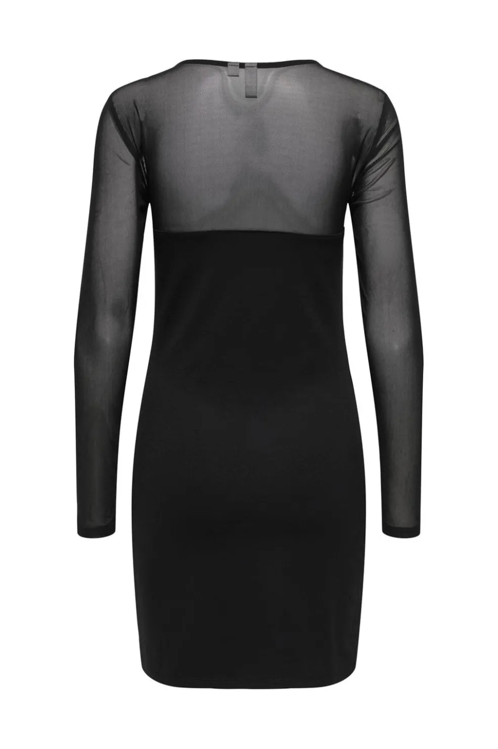 Sort bodycon-kjole fra Only med gennemsigtige mesh-detaljer på overdelen. Kjolen har en rund halsudskæring og går til midt på låret.