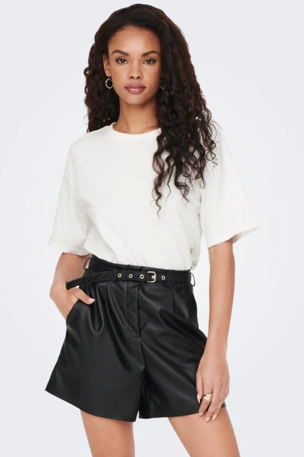Sorte shorts fra Only i imiteret læder med plisseringer foran. Shortsene har knælængde og kommer med et matchende bælte til styling.