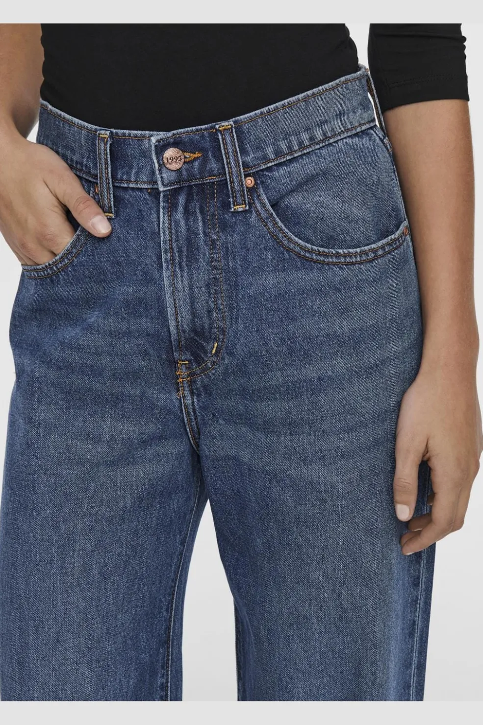 Brede jeans fra Only i mellemblå denim. De har en høj talje og en løs pasform med brede ben, der går ned til anklerne. Jeansene har både for- og baglommer.