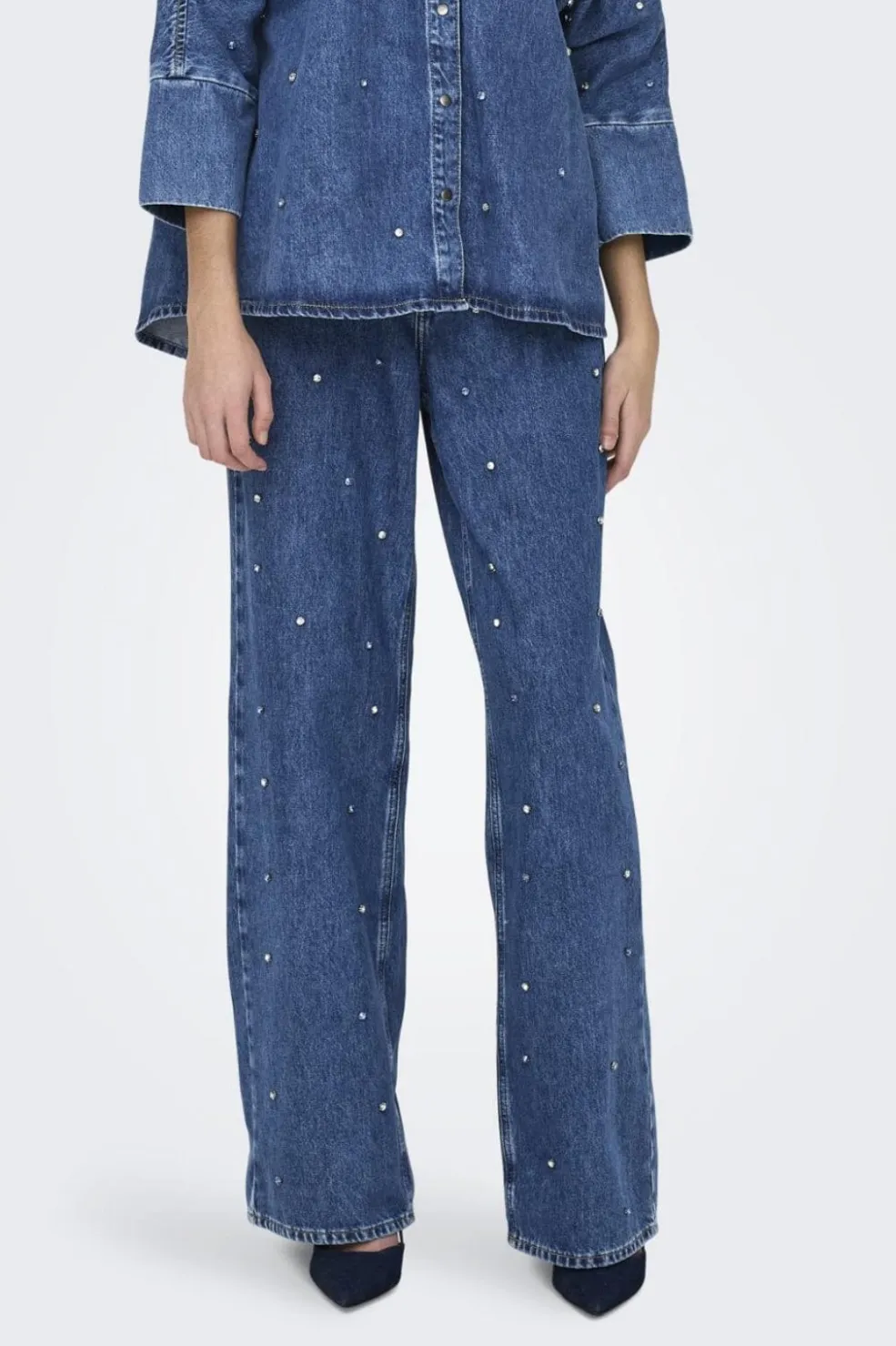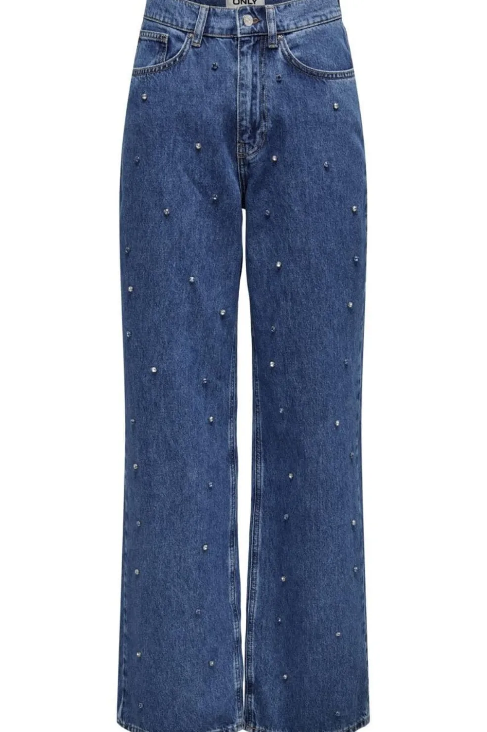 Vidde jeans fra Only i mellemblå denim med rhinsten. Jeansene har en løs pasform og diagonalt ribbede overflader, der giver et særegent udtryk.