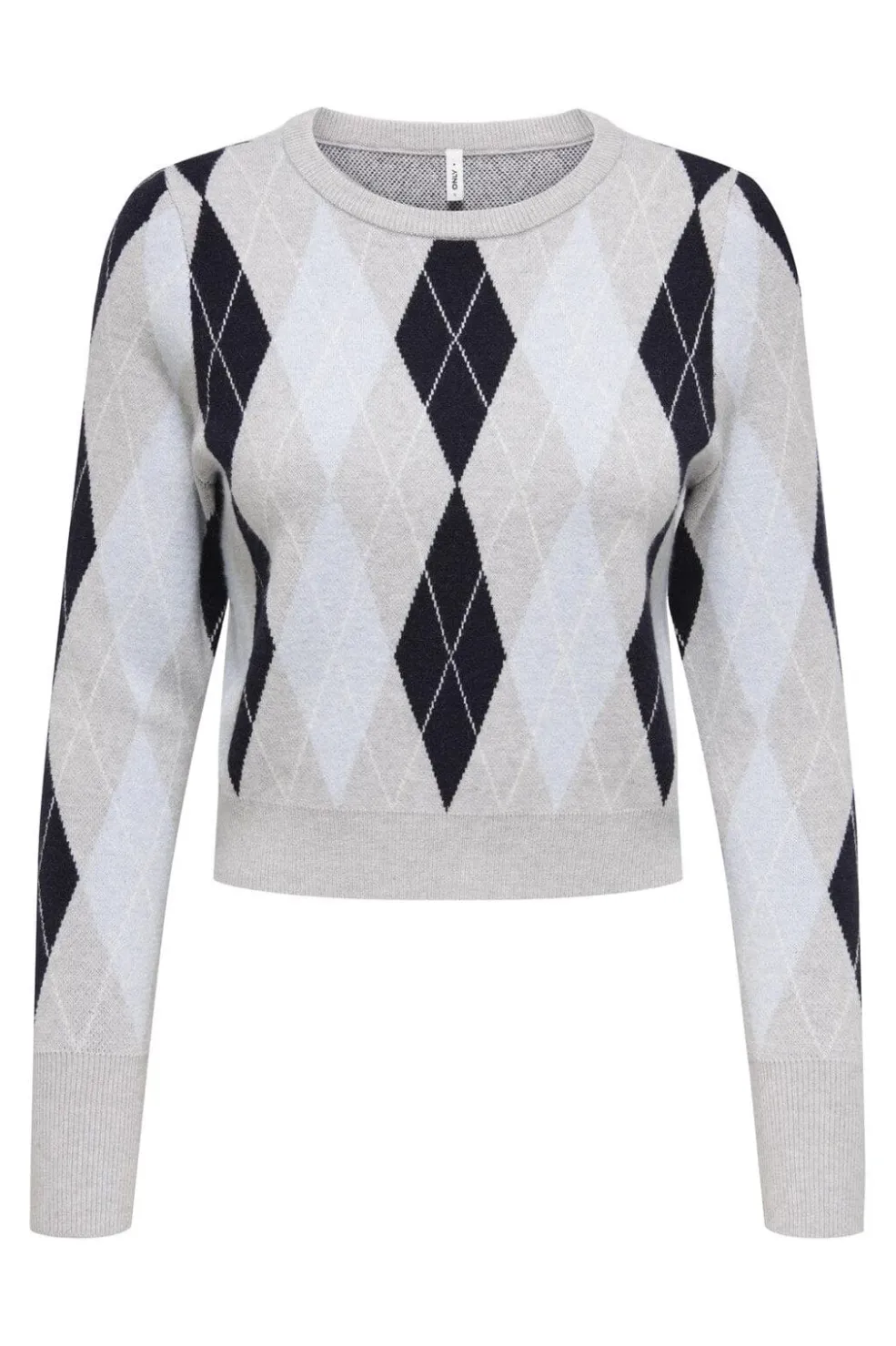 Striktrøje fra Only med argyle-mønster i lys grå, mørkeblå og lyseblå nuancer. Den har en rund halsudskæring og ribkanter ved ærmerne og forneden.