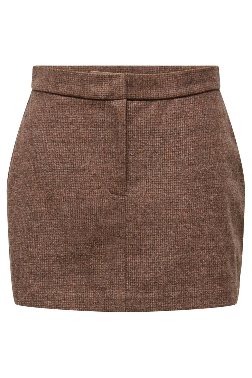 Kort, ternet nederdel fra Only i kastanjebrun med småternet mønster. Nederdelen har en regulær taljehøjde og lukkes med lynlås og knapper.
