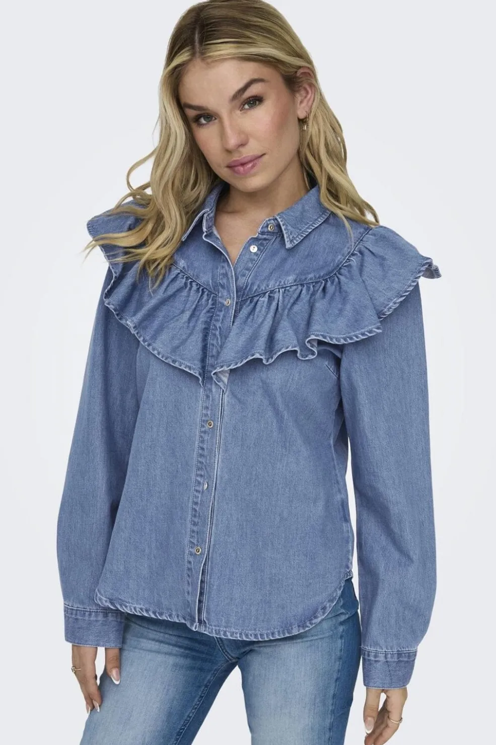 Denimskjorte fra Only med flæsedetaljer på brystet. Skjorten har en afslappet pasform og er fremstillet i blød denim med lange ærmer og skjortekrave.