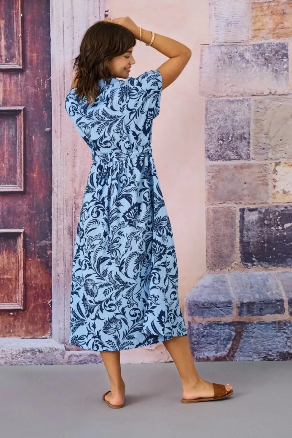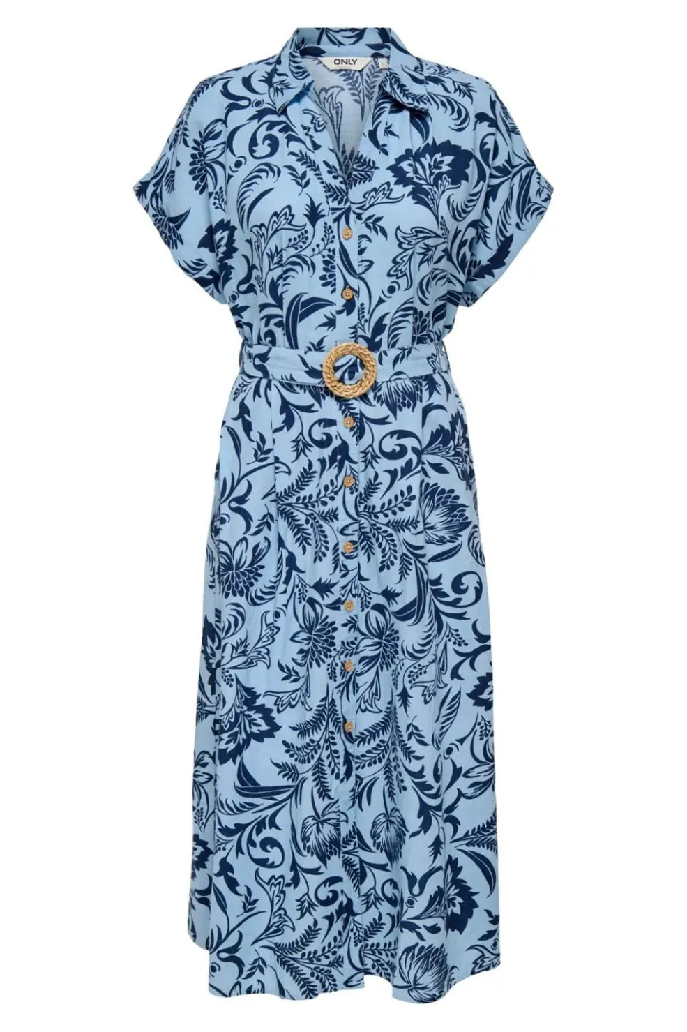 Lyseblå midi-skjortekjole fra Only med mørkeblåt blomstermønster. Kjolen har V-halsudskæring, knaplukning foran og bælte i taljen.