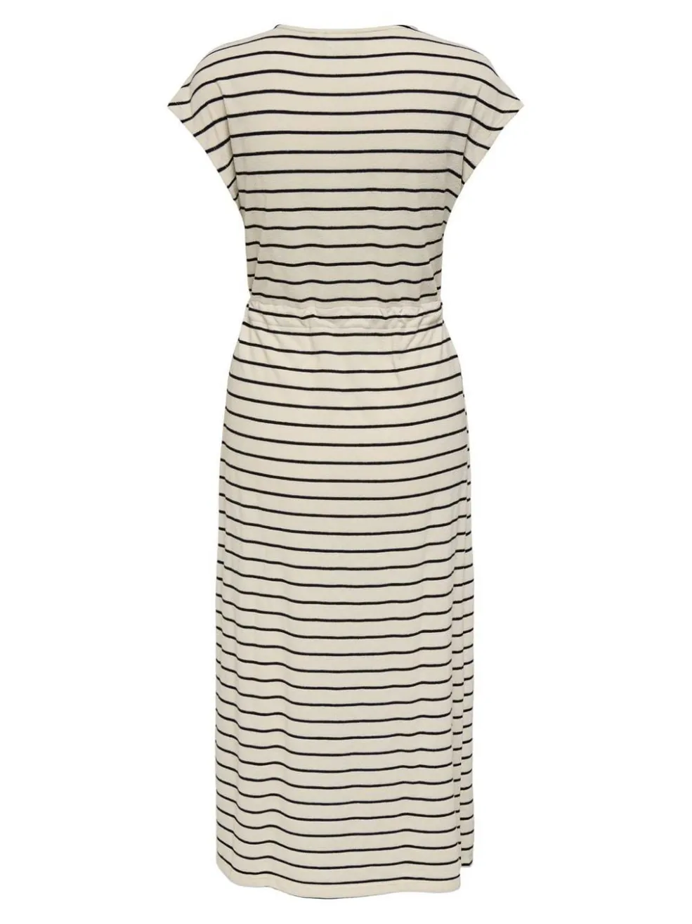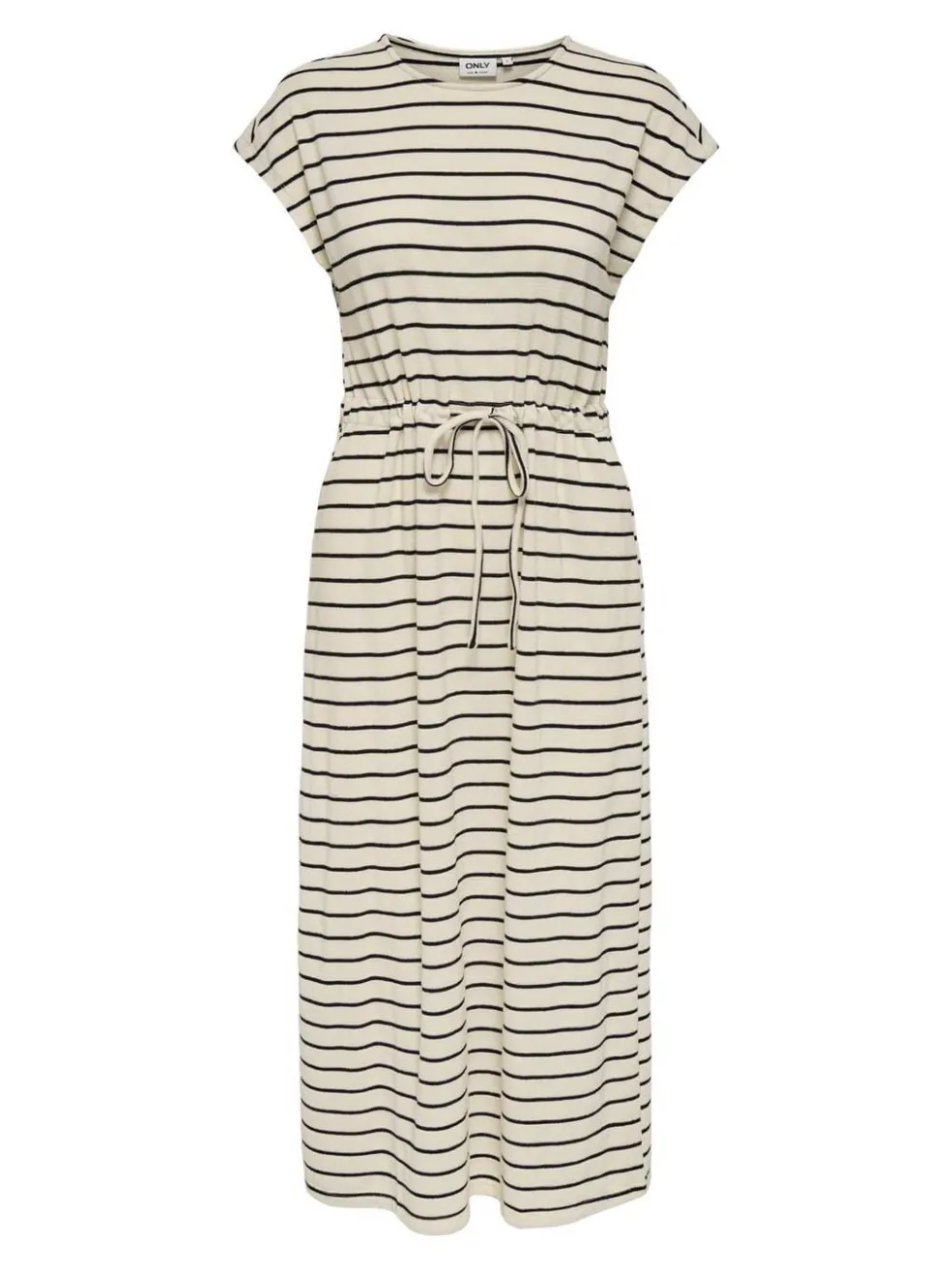 Beige kjole med sorte vandrette striber fra Only. Kjolen har korte ærmer, rund halsudskæring og bindebånd i taljen. Den falder til midt på læggen og har en regular fit.