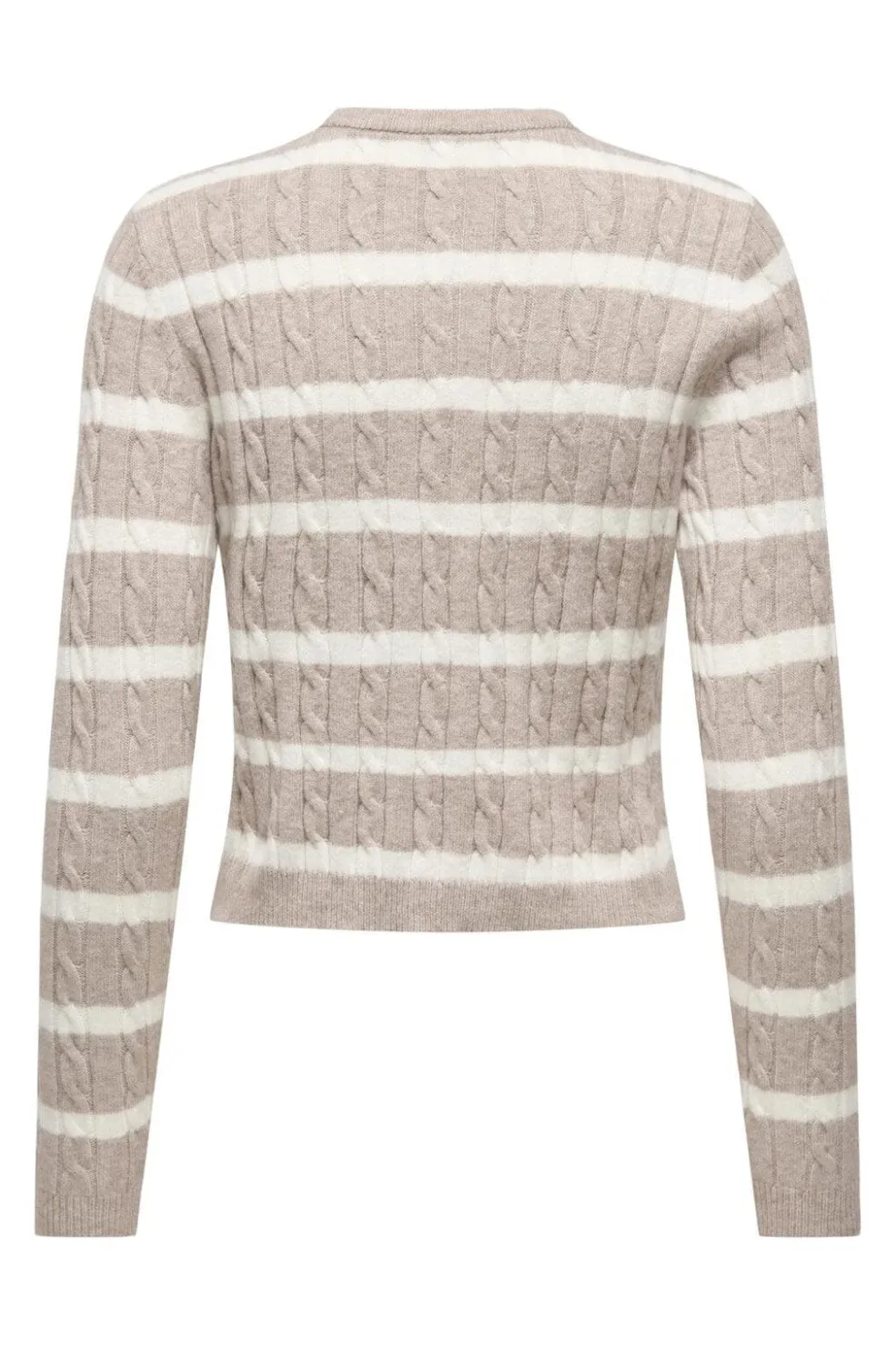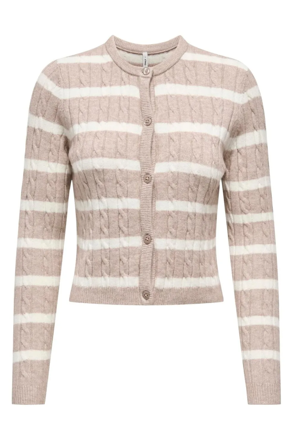 Stribet cardigan fra Only med kabelstrikmønster i beige og cremehvide nuancer. Cardiganen har knaplukning og lange ærmer med ribstrikkede manchetter.