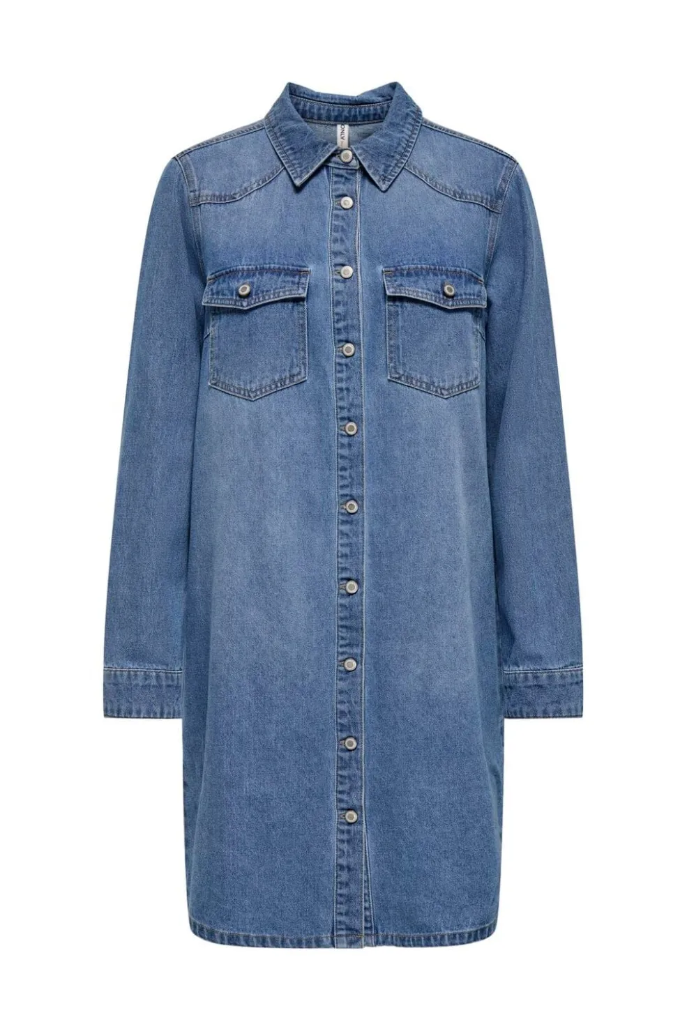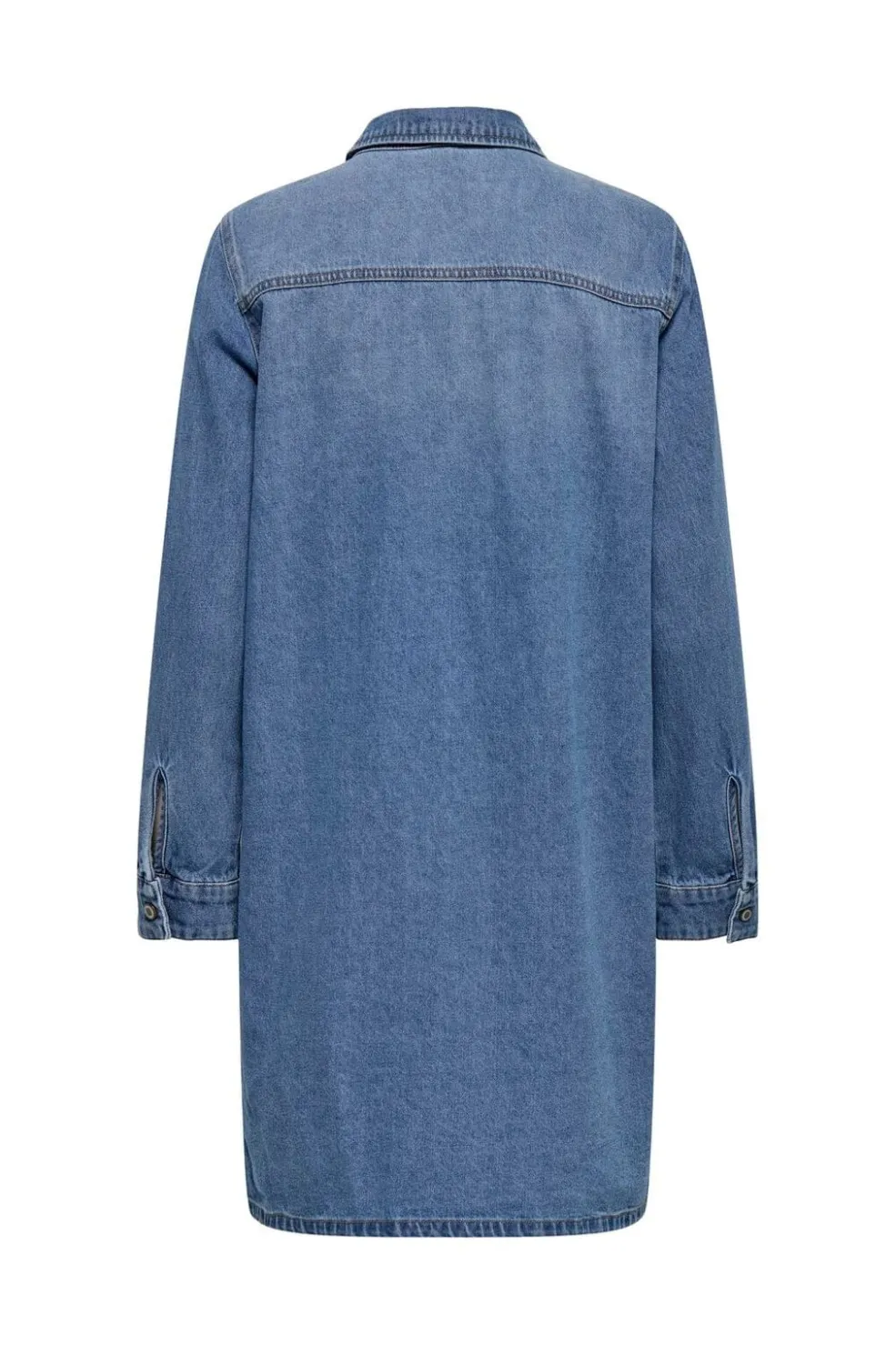 Denimkjole fra Only i mellemblå denim. Kjolen har en skjortekrave, lange ærmer og en lårkort længde med regulær pasform.