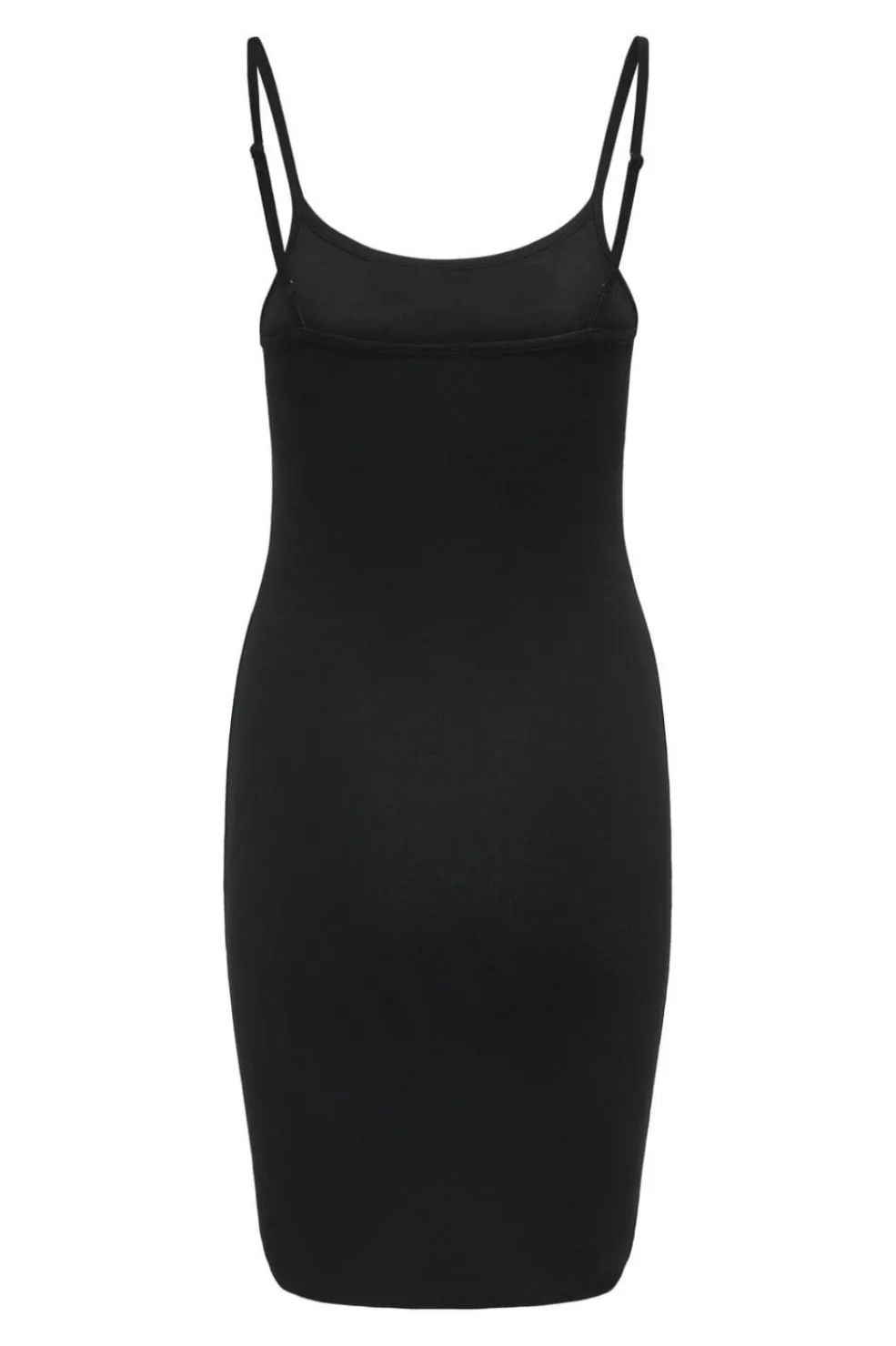 Sort kjole fra Only med tynde stropper og rund halsudskæring. Kjolen har en tætsiddende pasform og går til midt på låret.