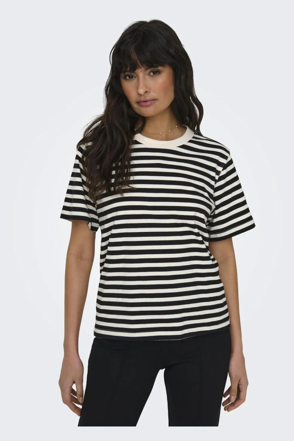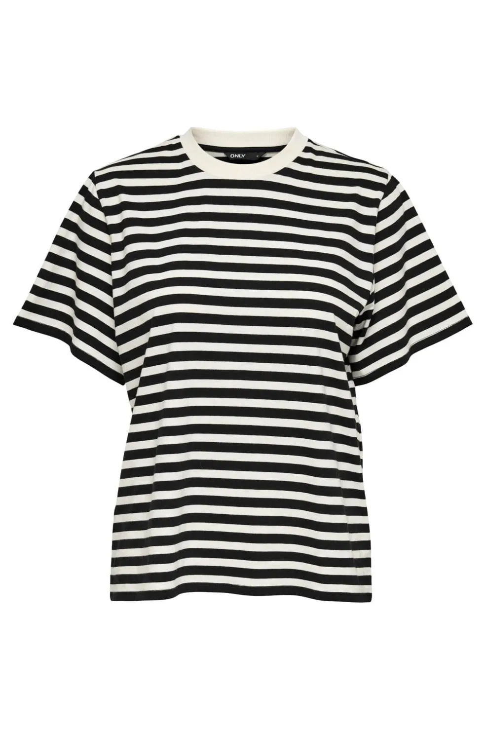 Stribet t-shirt fra Only i sort og hvid. T-shirten har en rund halsudskæring og korte ærmer med en regular pasform, der giver god bevægelsesfrihed.