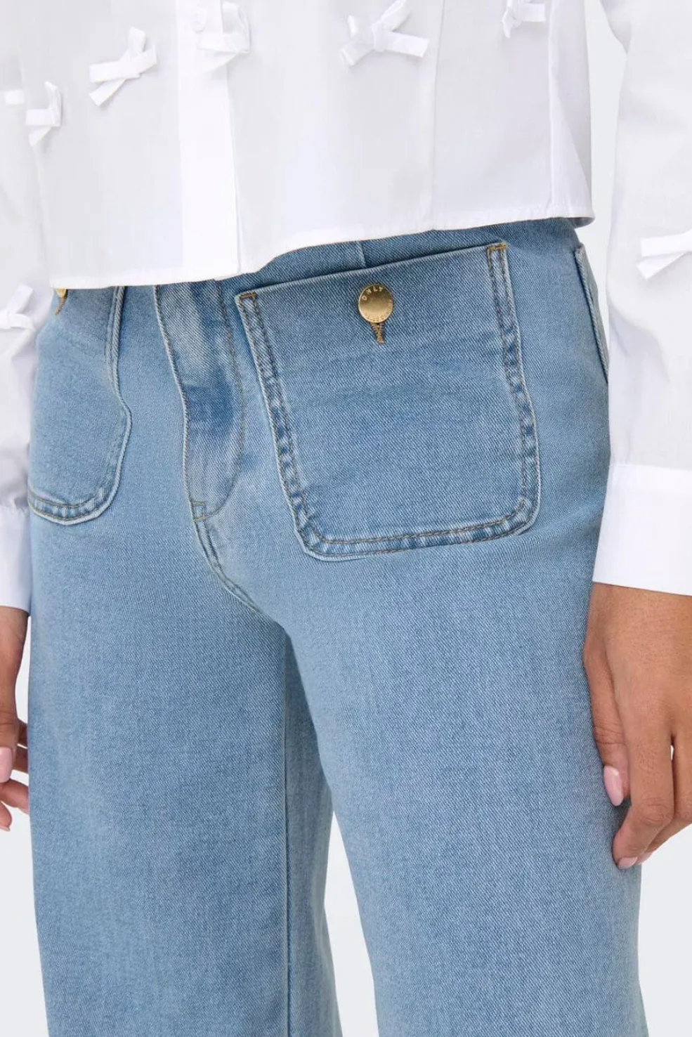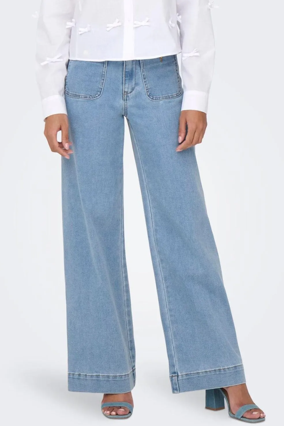 Lyseblå denimbukser fra Only med høj talje og bred benform. Bukserne har en løs pasform og går til anklen.