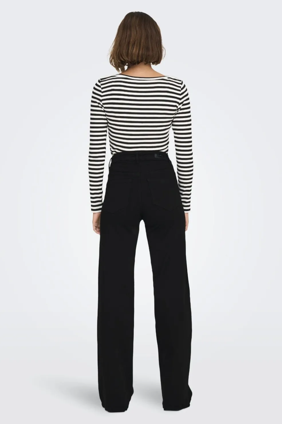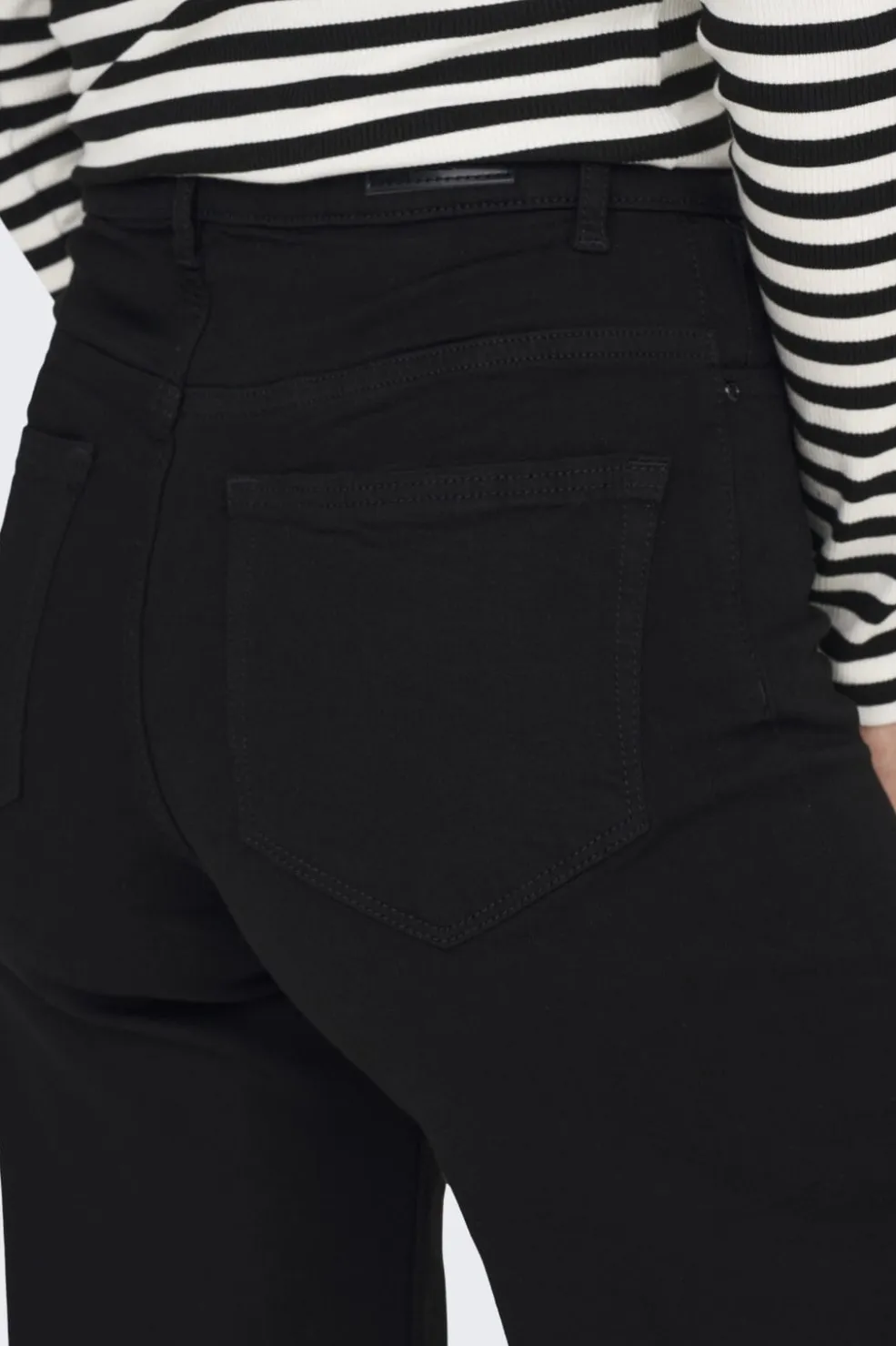 Sorte denimbukser fra Only med høj talje og brede ben. Bukserne har for- og baglommer samt bæltestropper i taljen og lukkes med lynlås i gylpen.