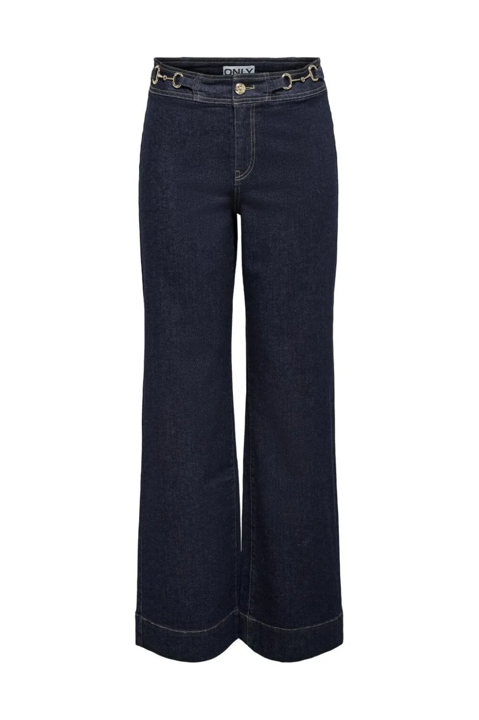 Mørkeblå jeans fra Only med vide ben og ankellængde. Bukserne har høj talje med dobbelt knaplukning og spænde i linningen.