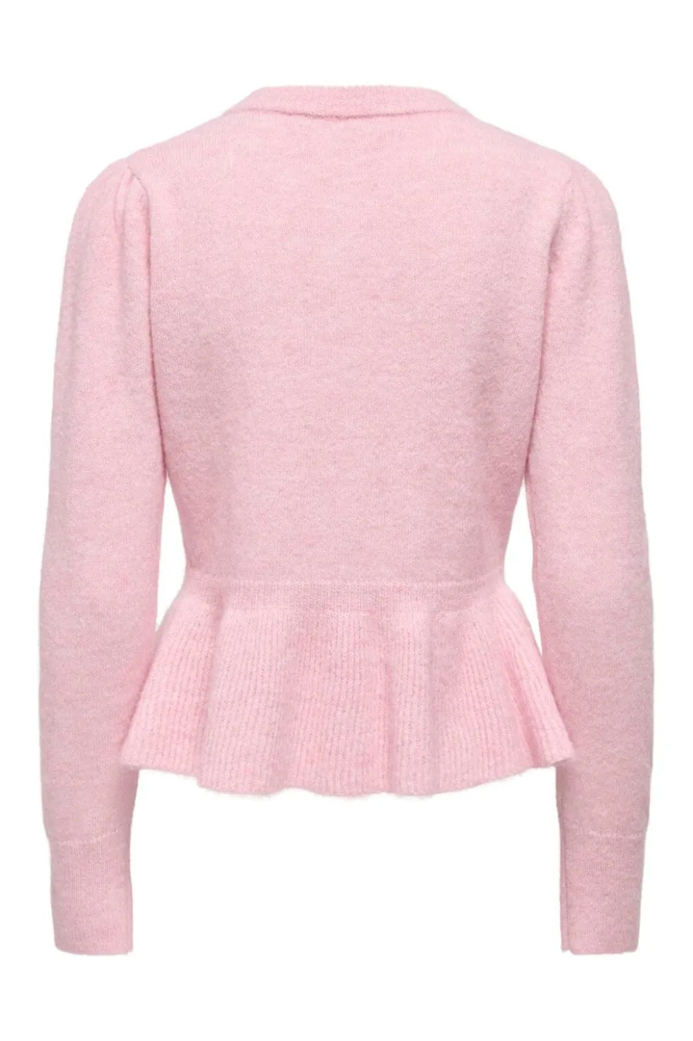 Lyserød cardigan fra Only i en rosa melange-nuance. Cardiganen har perleknapper, en peplumdetalje og ribkanter, der giver den et feminint udtryk.