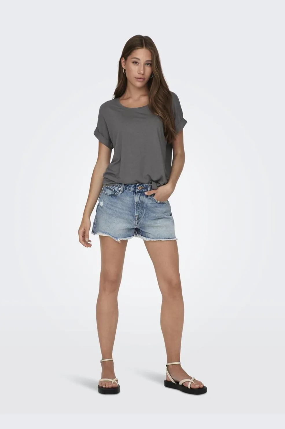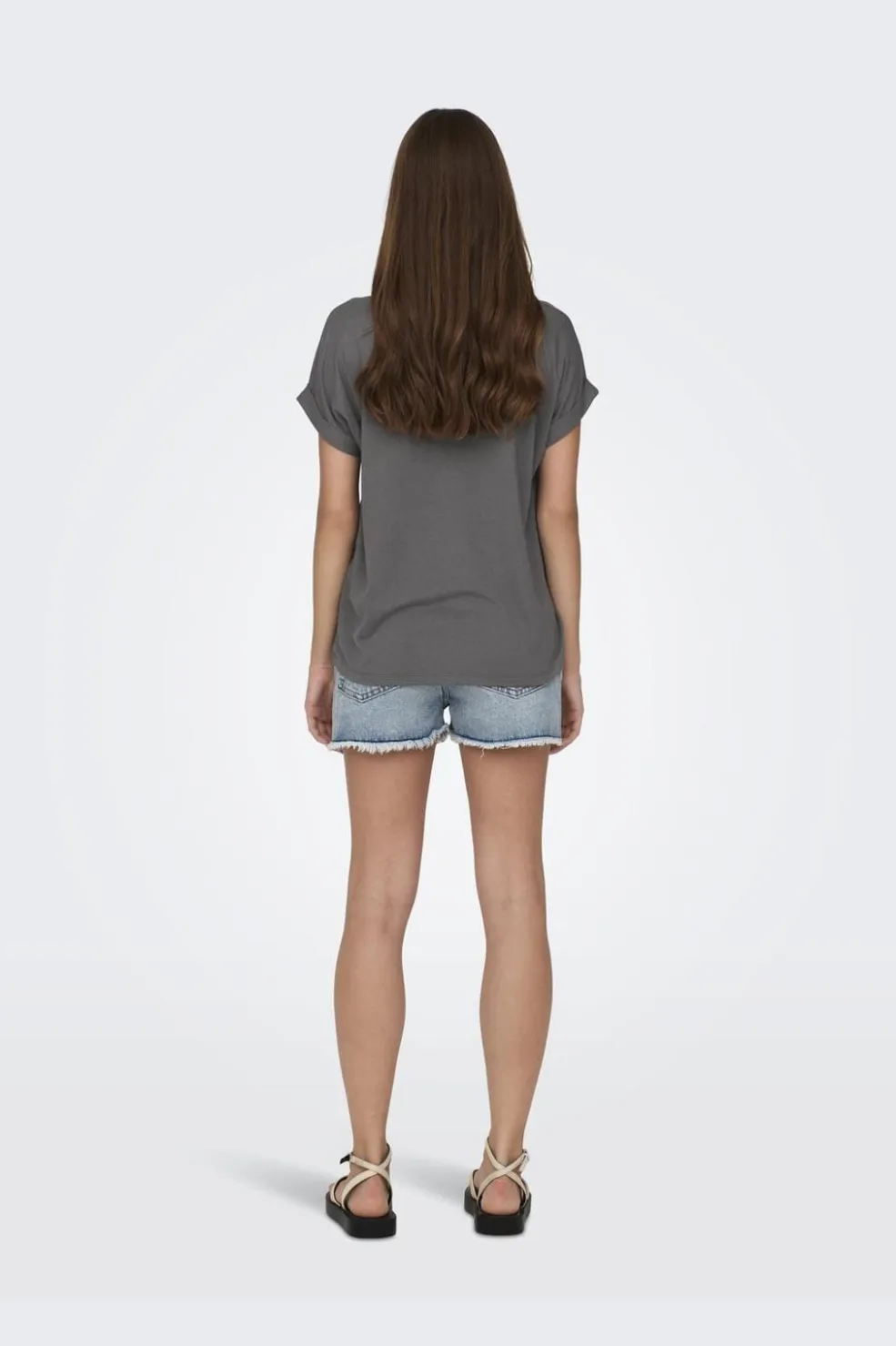 Grå t-shirt fra Only med rund halsudskæring og korte ærmer med opsmøg. T-shirten har en regular fit og er lavet i en blød materialeblanding.