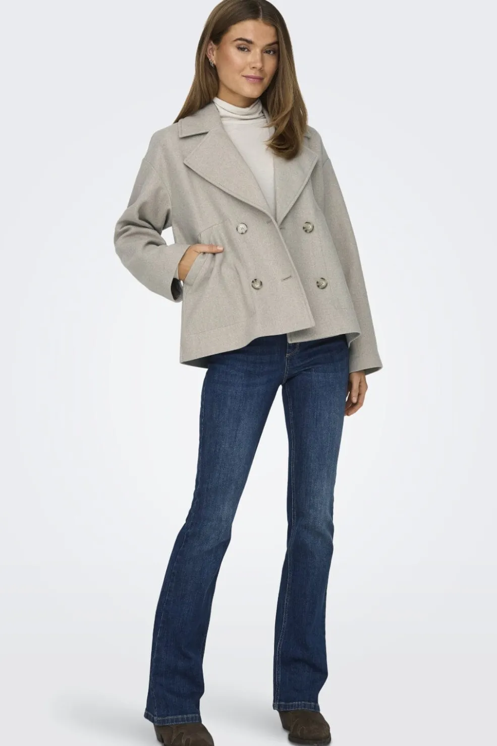 Jakke fra Only i beige-grå meleret nuance. Den har skjortekrave, dobbeltknapper og lange ærmer. Sidelommerne er placeret i en praktisk højde på jakken.