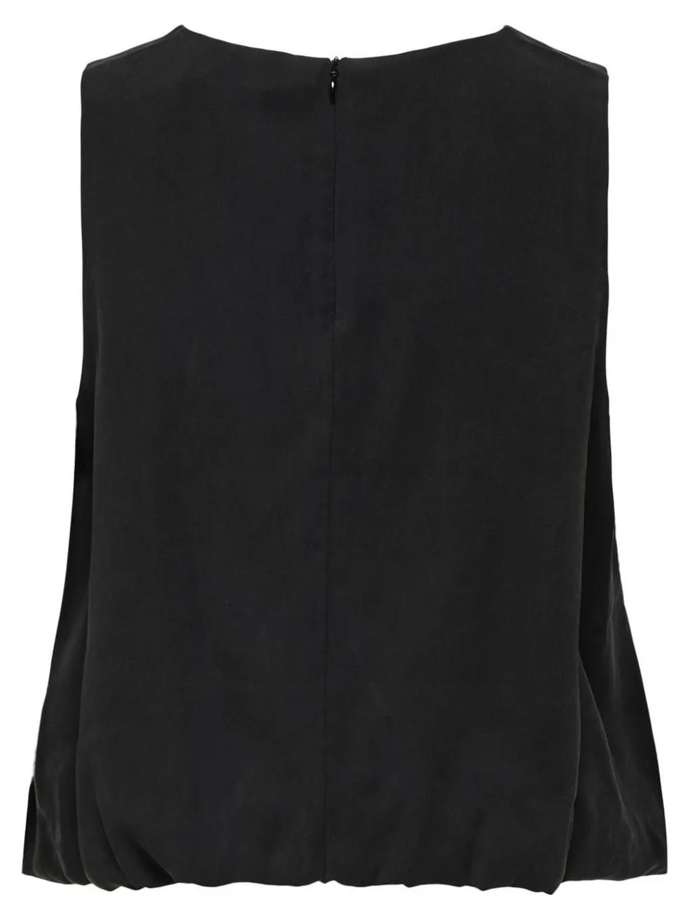 Sort ærmeløs top fra Only med rund halsudskæring. Toppen har en elastisk kant, der skaber en let bubble-effekt, og den lukkes med lynlås i ryggen.