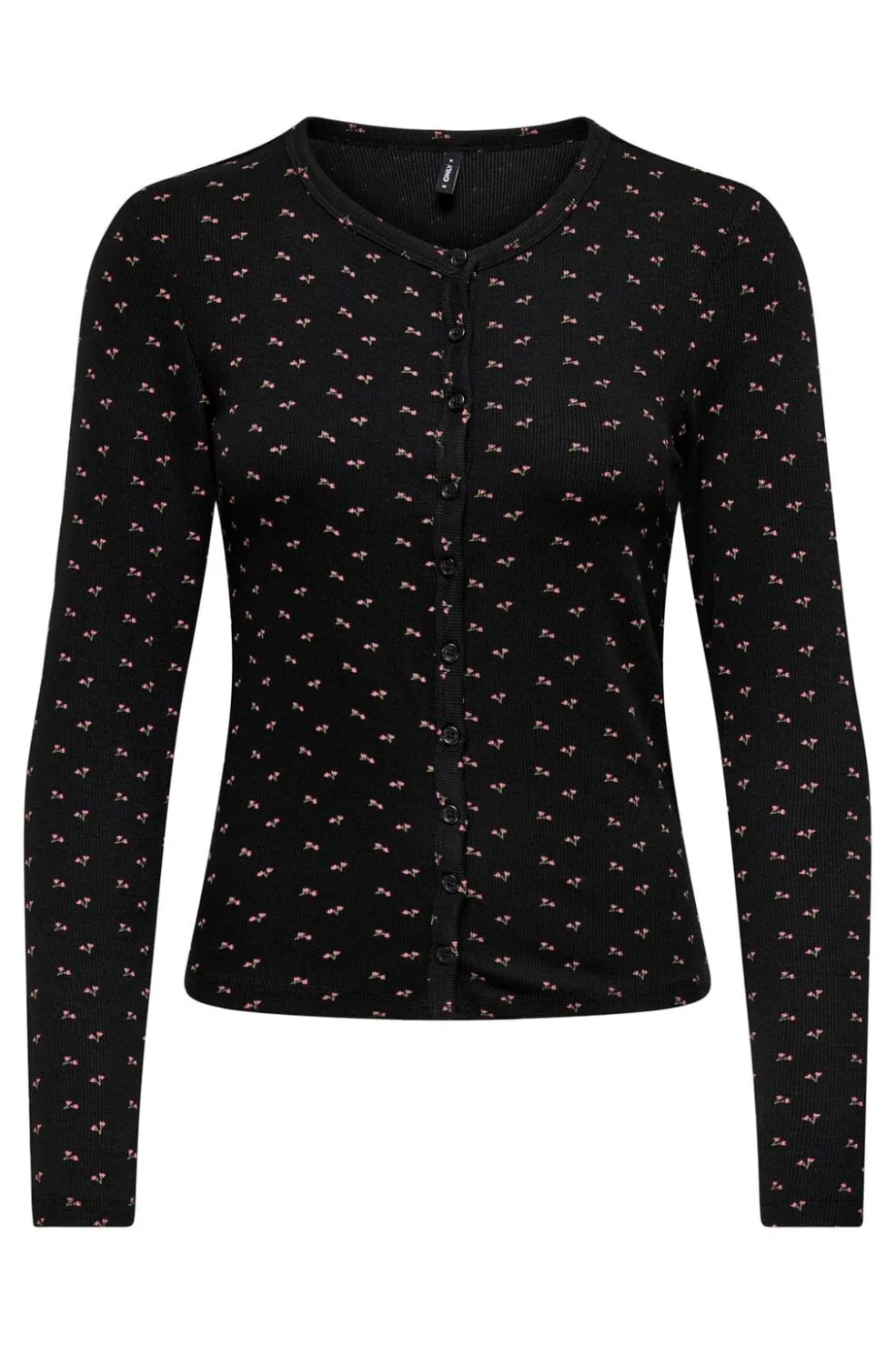 Sort cardigan fra Only med små rosa blomster. Den har rund hals og lange ærmer med knaplukning foran. Stoffet er i blød jersey med et gennemgående blomstermønster.