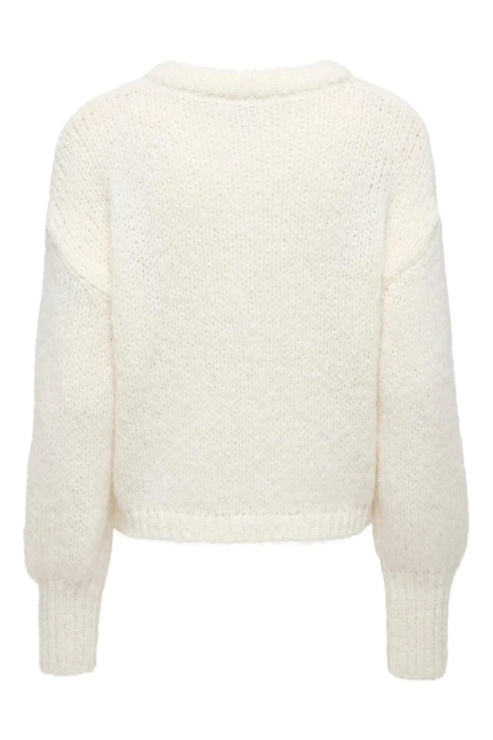En hvid cardigan fra Only, lavet af 100 % genanvendt polyester. Cardiganen har en V-hals og knaplukning foran med matchende knapper.