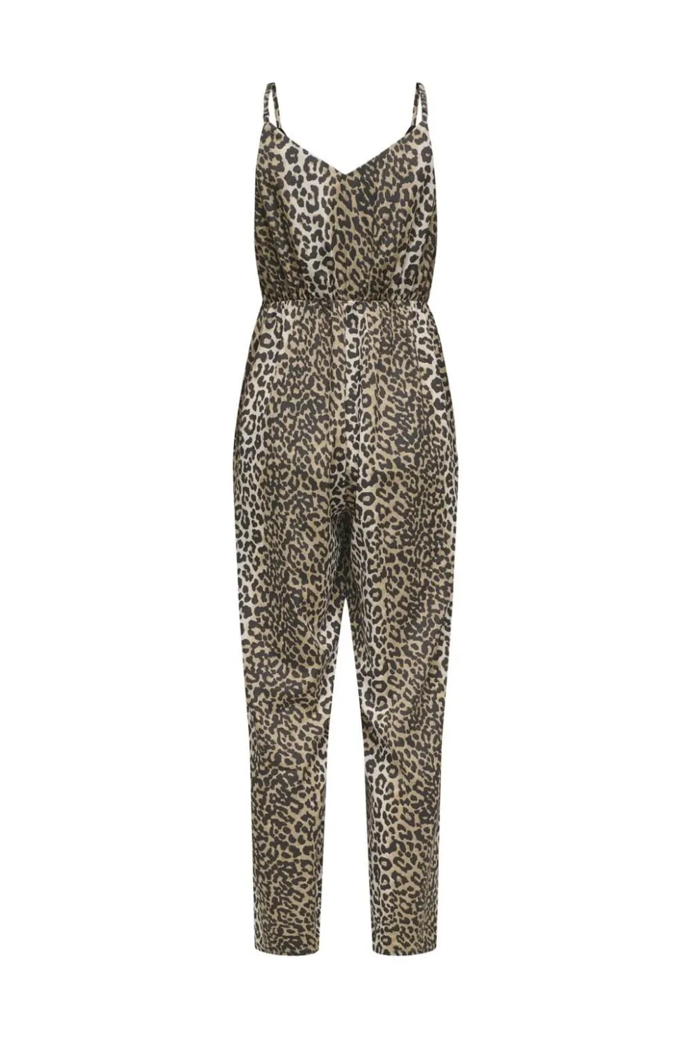 Buksedragten fra Only har et leopardmønster i brune nuancer. Den har en løs pasform med tynde stropper og V-udskæring. Designet går ned til anklerne.