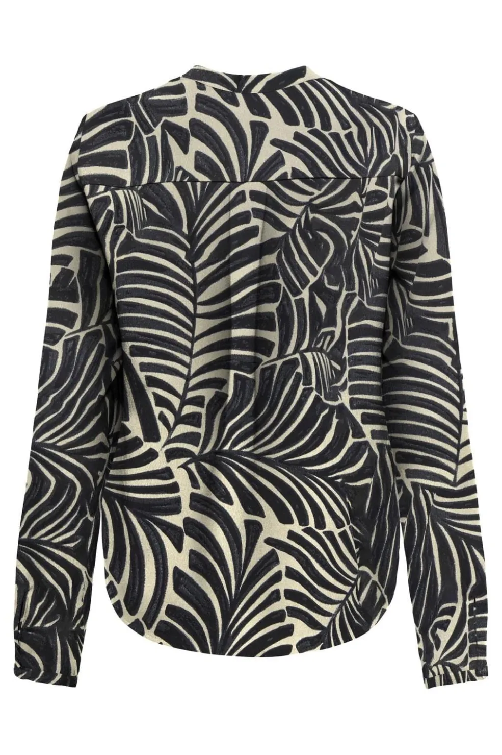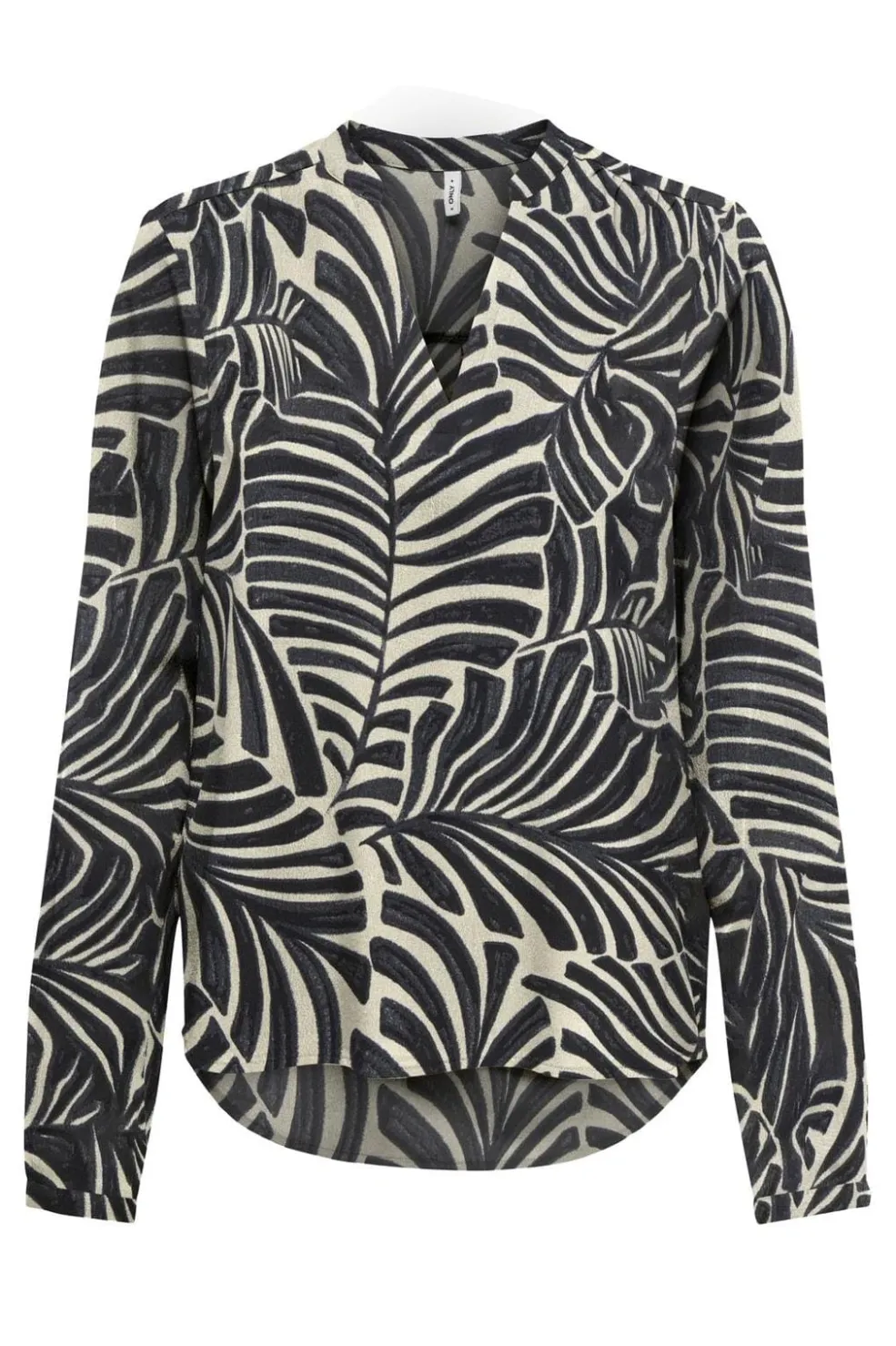 Sort langærmet top fra Only med bladprint i sort og beige. Toppen har en V-udskæring og en buet søm med et længere bagstykke.