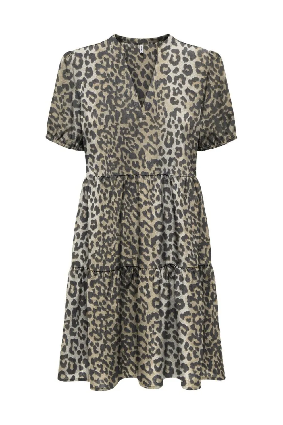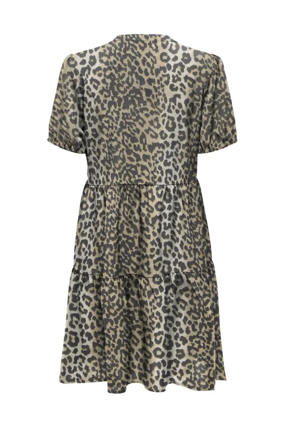 Kjole fra Only med leopardprint i beige og grå nuancer. Den har tre lag flæser, V-udskæring og korte ærmer. Et design med fokus på bevægelse og detaljer.