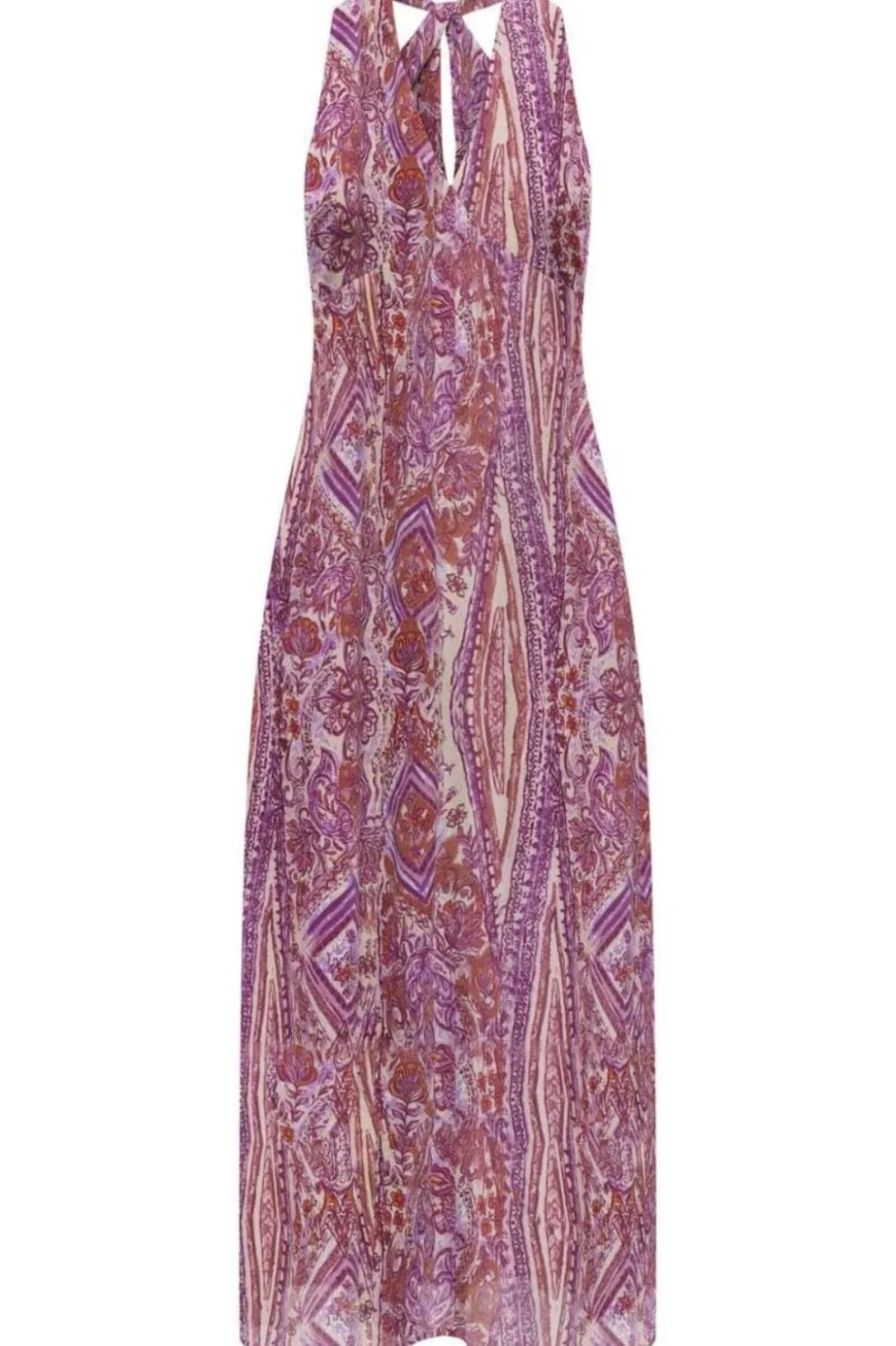 Lang kjole fra Only med halterneck og bindebånd. Kjolen har et farverigt paisley-mønster i pink og lilla nuancer samt en V-udskæring foran.
