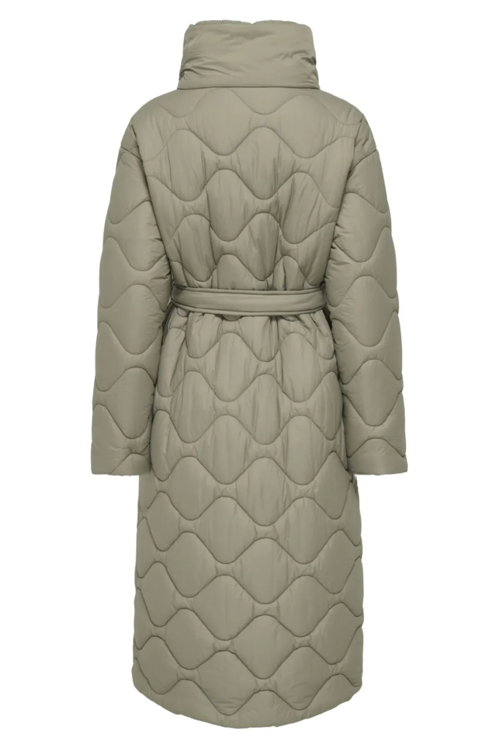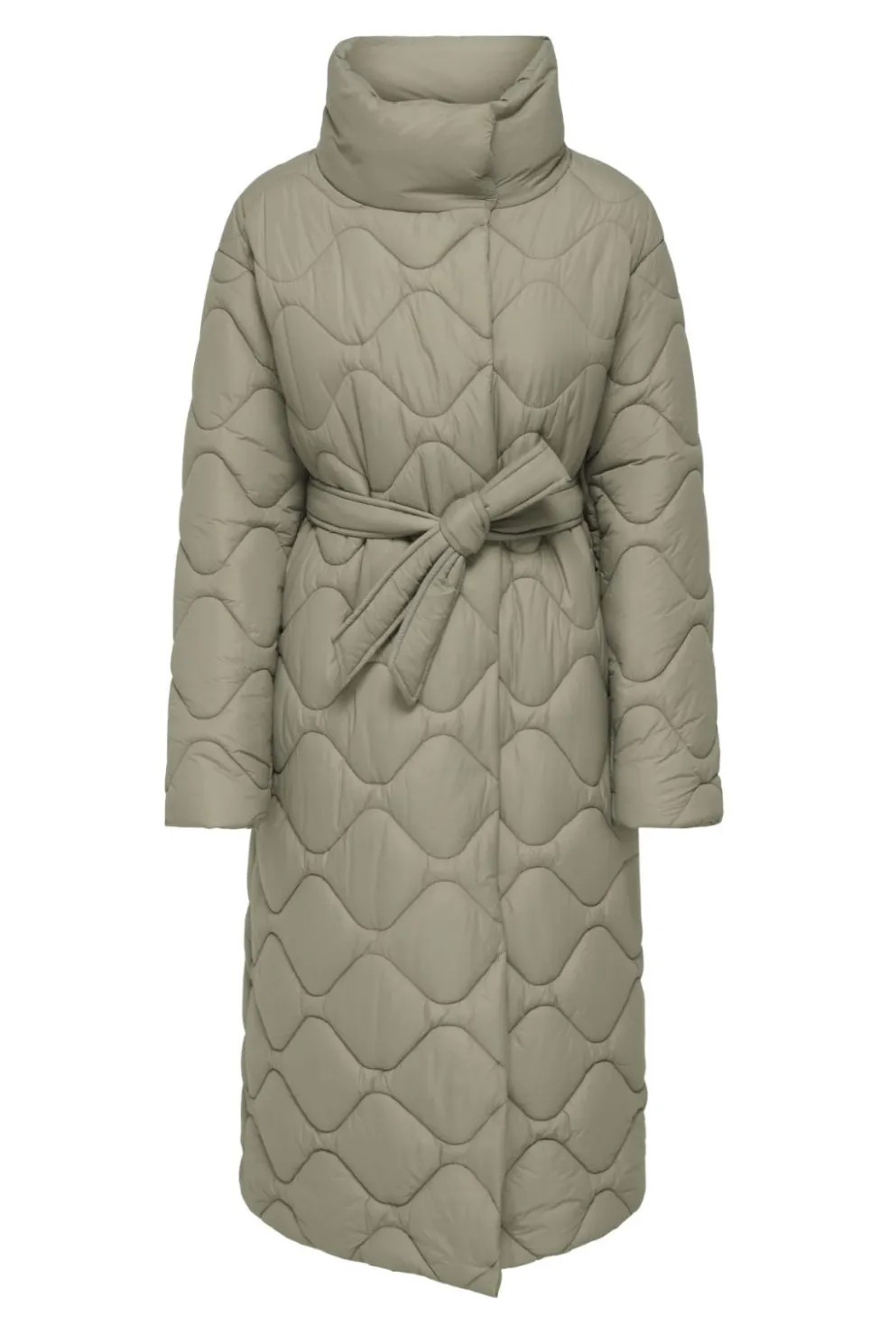 Quiltet frakke fra Only i en beige-grøn nuance. Frakken har et bølgeformet quiltet mønster over hele overfladen og er polstret med syntetisk fyld.