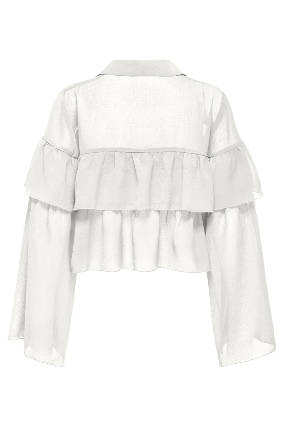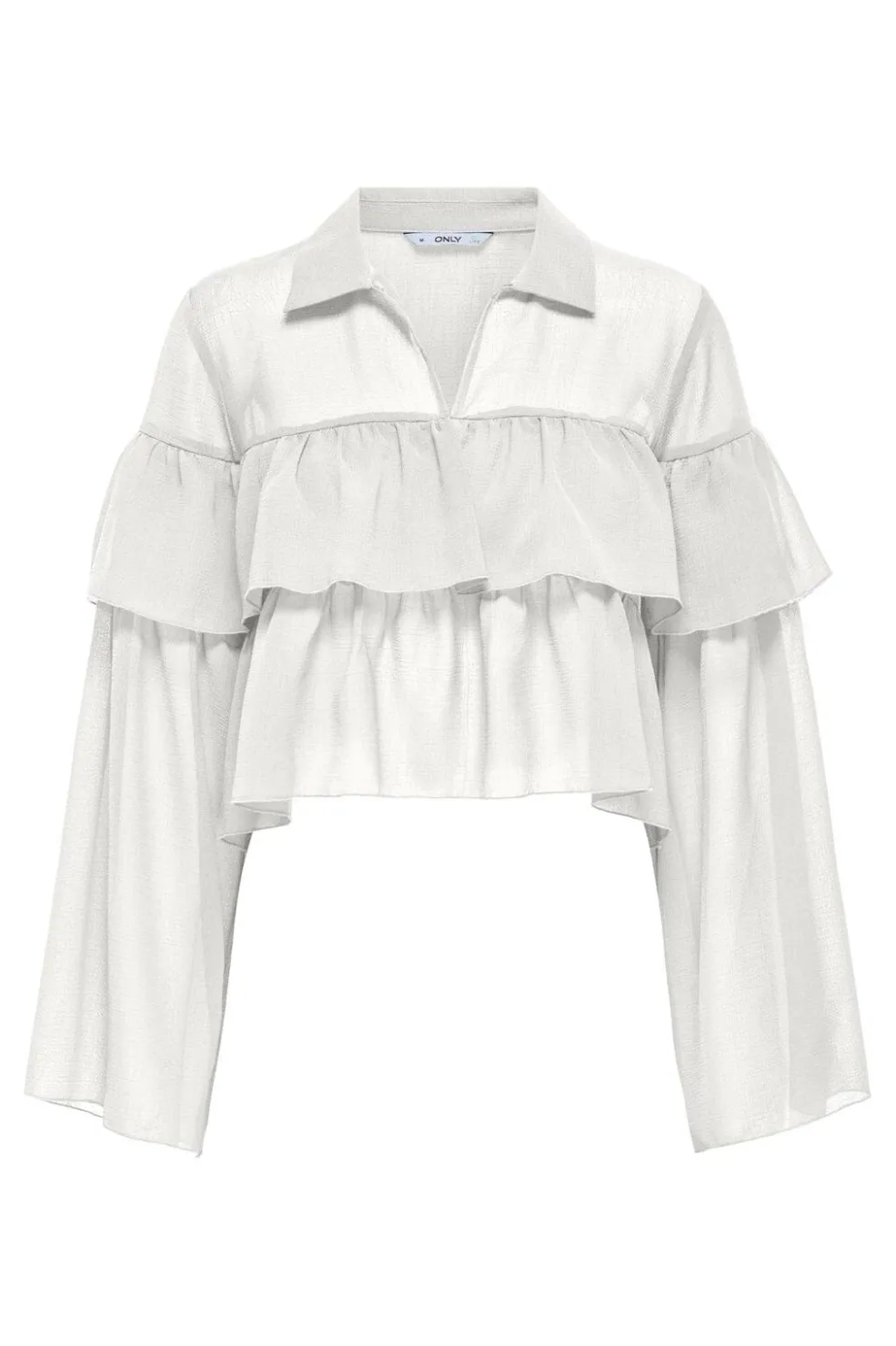 Hvid top fra Only, der kan bruges til både hverdag og festlige lejligheder. Toppen har flæsedetaljer og lange ærmer.