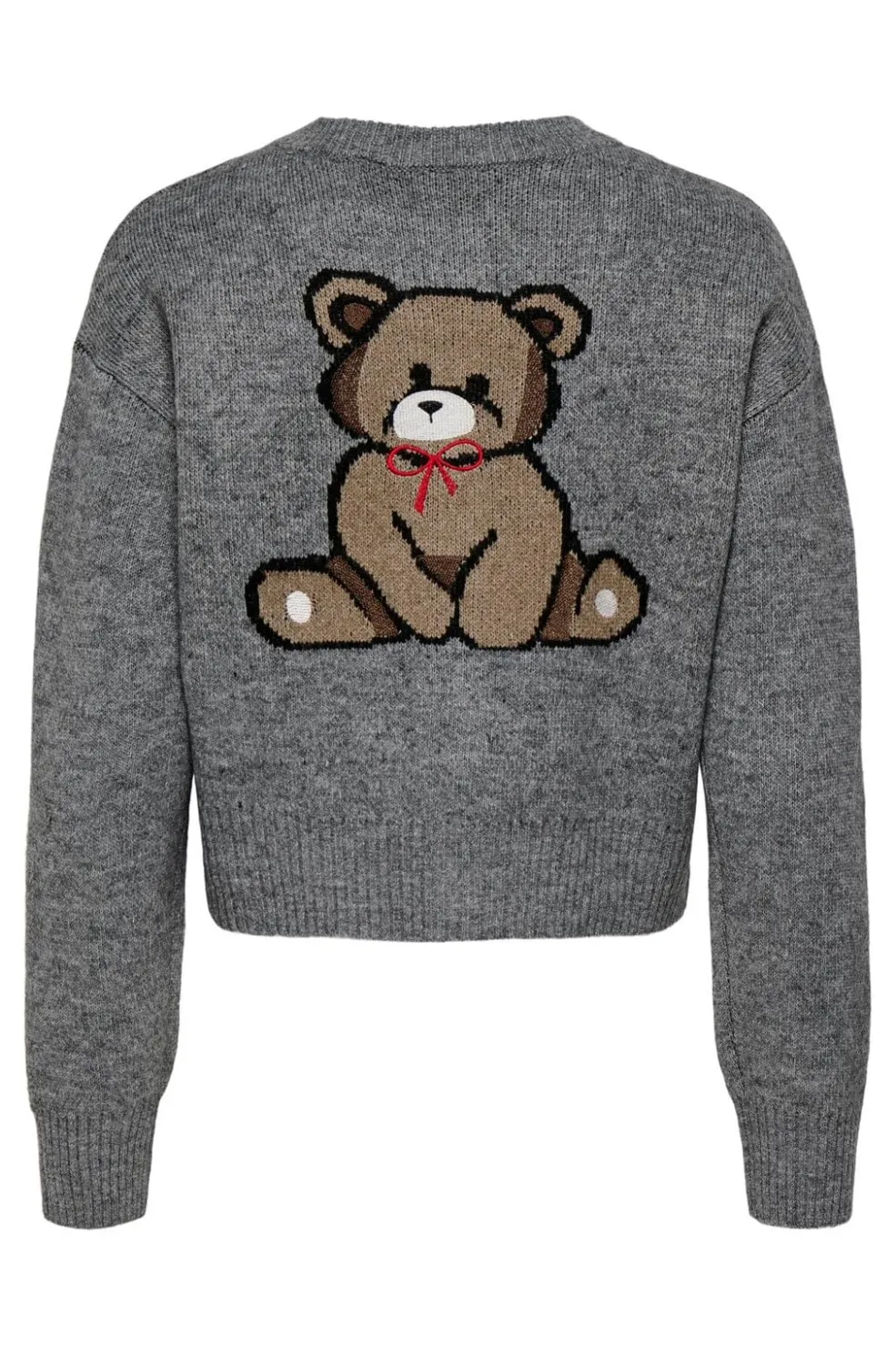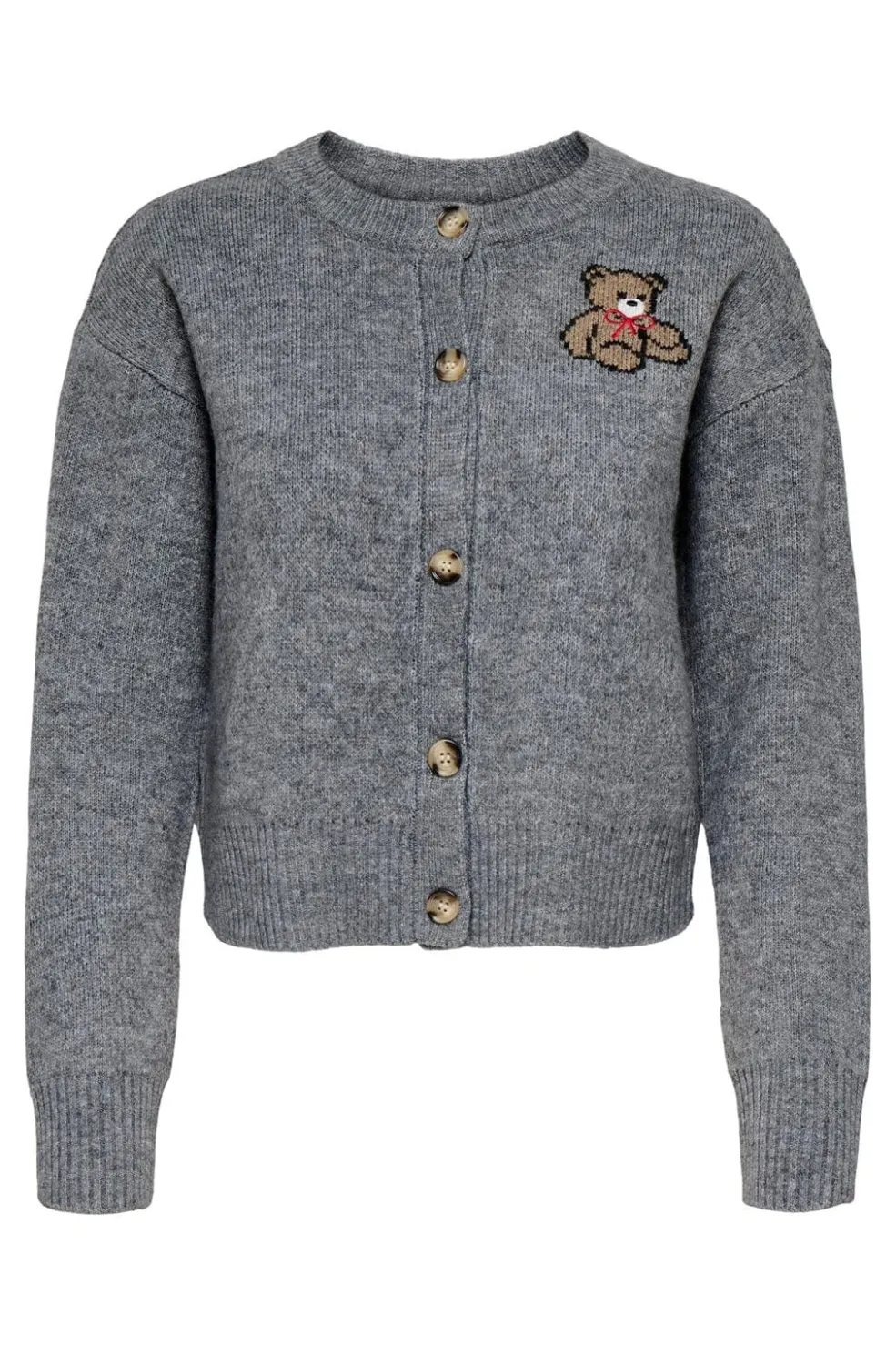 Grå cardigan fra Only med teddy-detaljer. Cardiganen har en løs pasform med ribkant ved manchetterne og nederst.