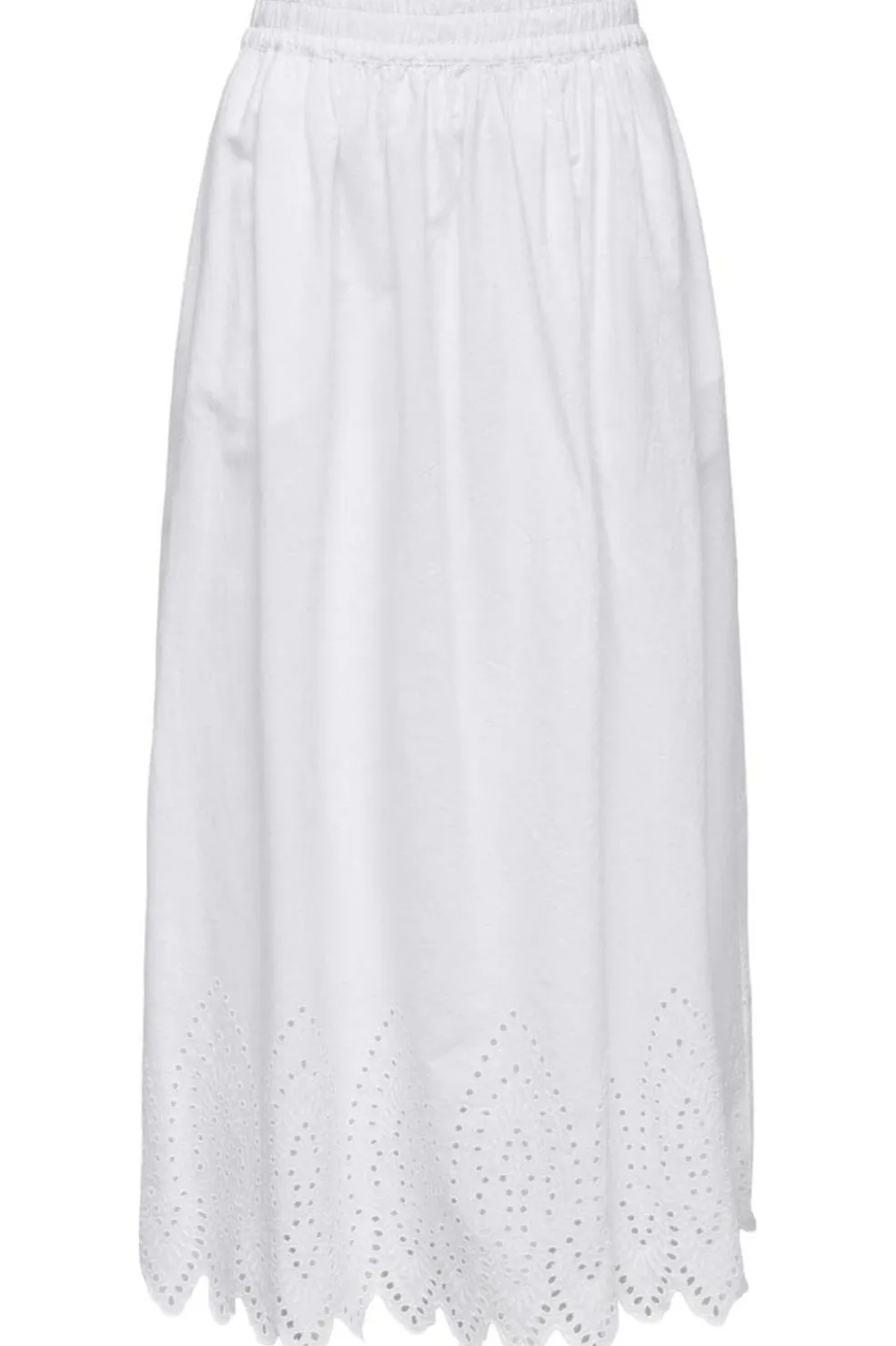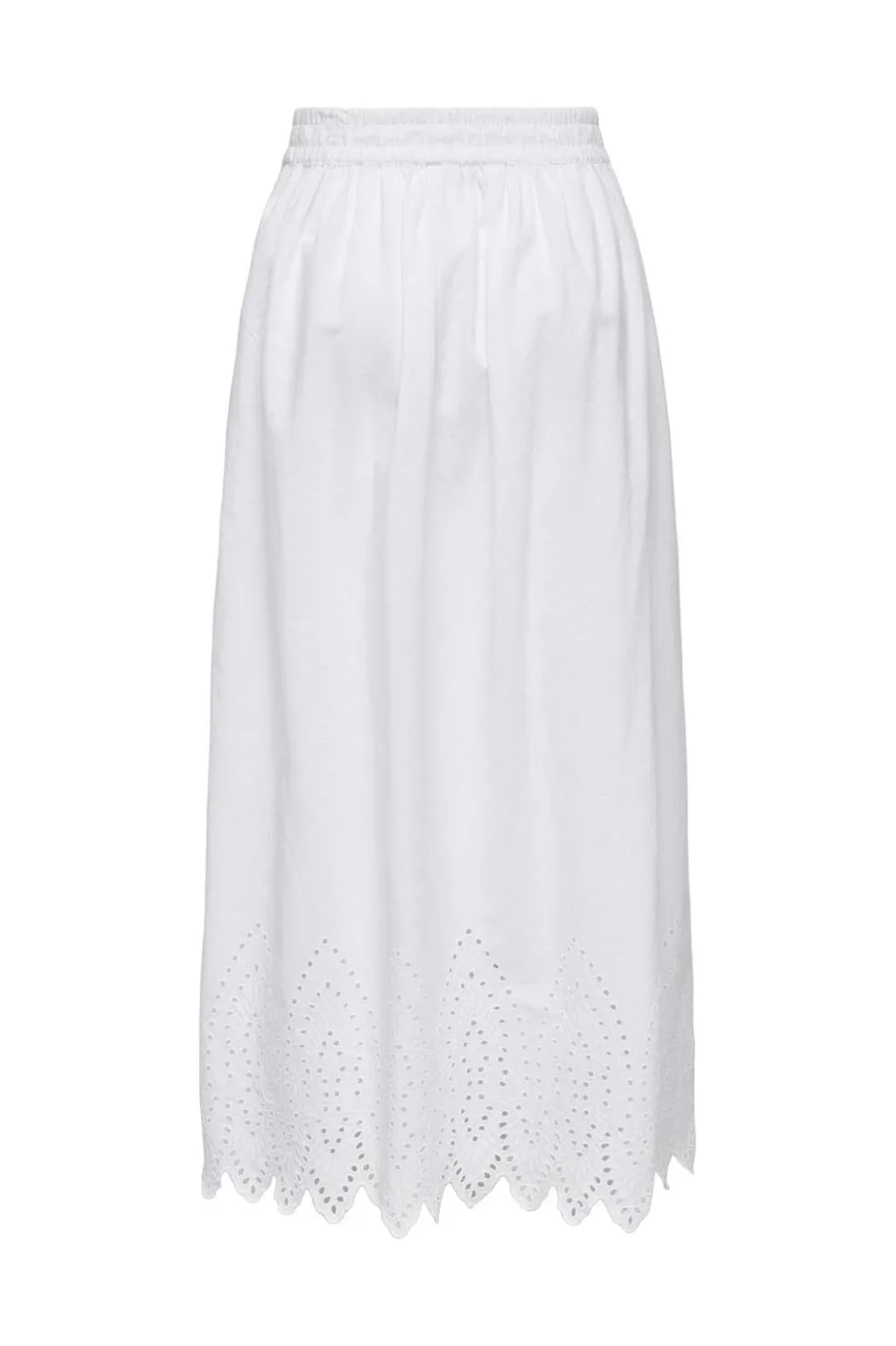 Hvid maxinederdel fra Only med broderede detaljer langs kanten. Nederdelen har en elastisk linning og en lang længde, der går ned til fødderne.