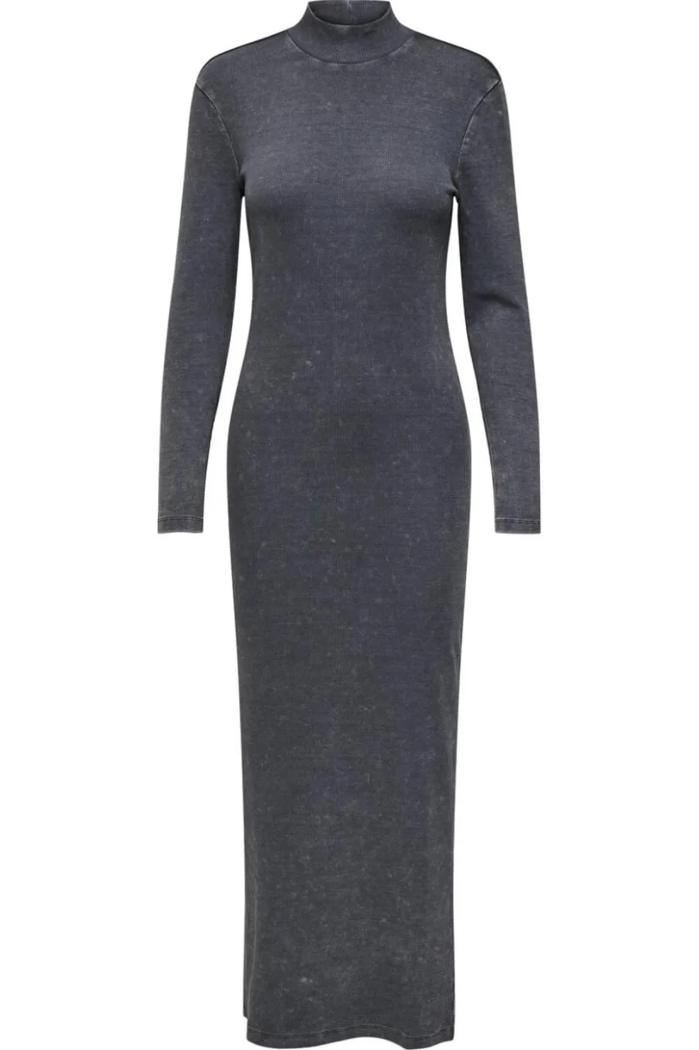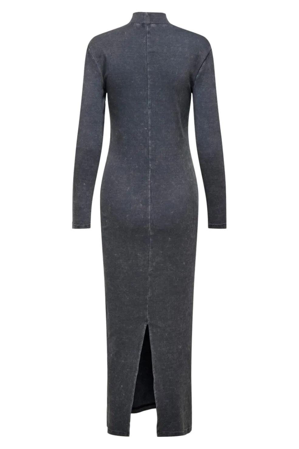 Sort kjole fra Only i 2×2 ribstrik med høj hals. Kjolen har lange ærmer og en tætsiddende silhuet, der går ned til anklerne. En slids bagpå giver god bevægelsesfrihed.