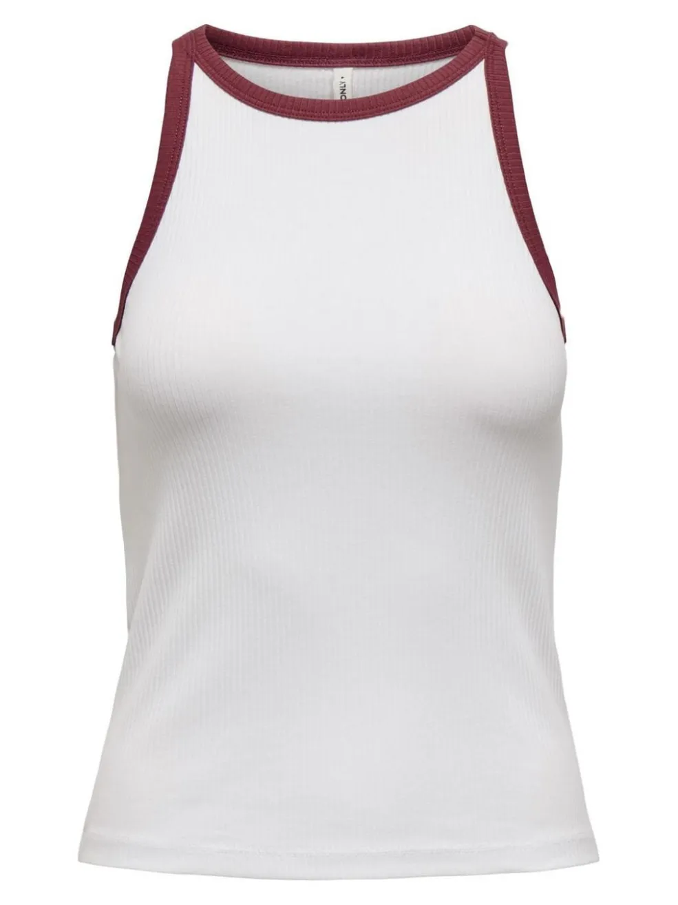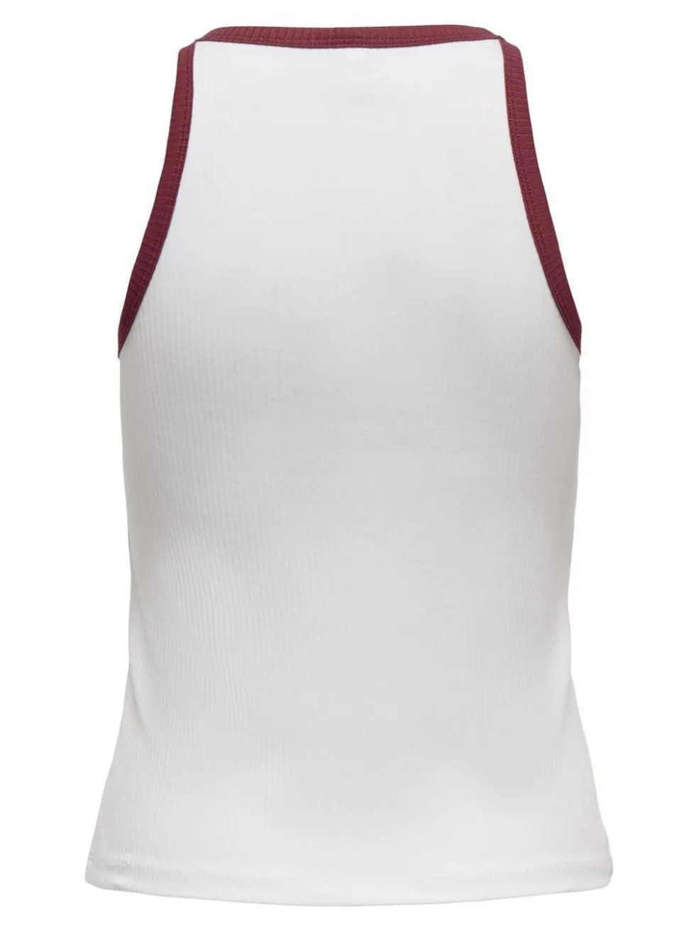 Hvid ærmeløs top fra Only med bordeauxfarvet kant. Toppen har en ribbet tekstur og rund hals, hvor den dekorative syning skaber en sporty detalje.