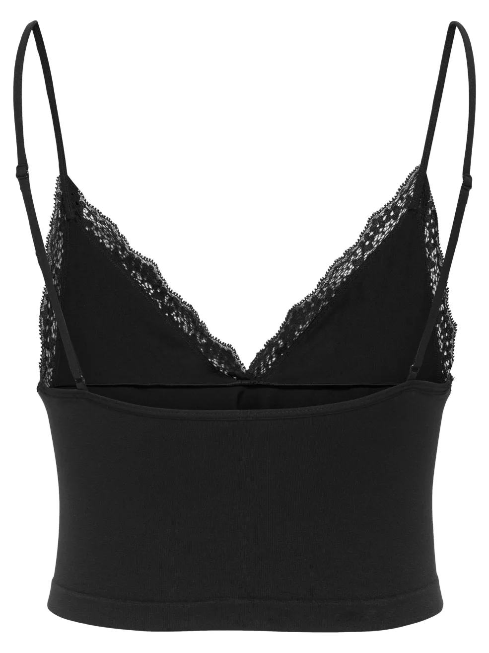 Sort singlet fra Only med V-halsudskæring og blondedetaljer. Toppen har en tætsiddende pasform og smalle stropper, der kan justeres efter behov.