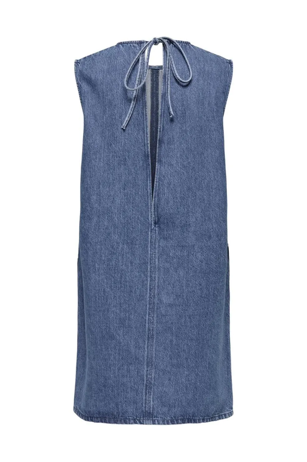 Ærmeløs denimkjole fra Only i medium blå denim. Kjolen har en rund halsudskæring og bindedetaljer på ryggen, der giver den et enkelt og rent udtryk.