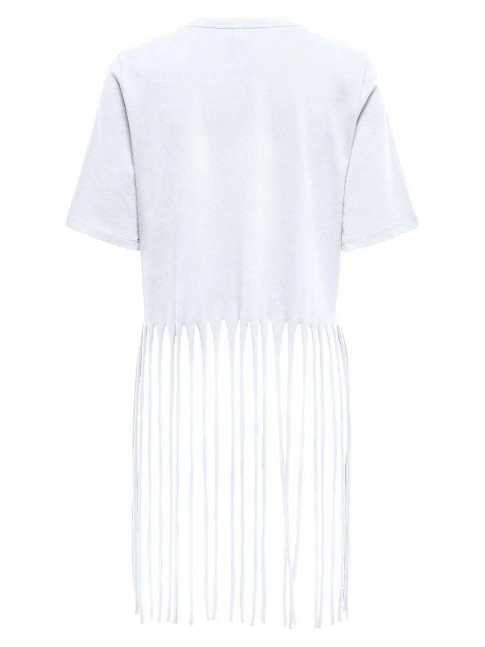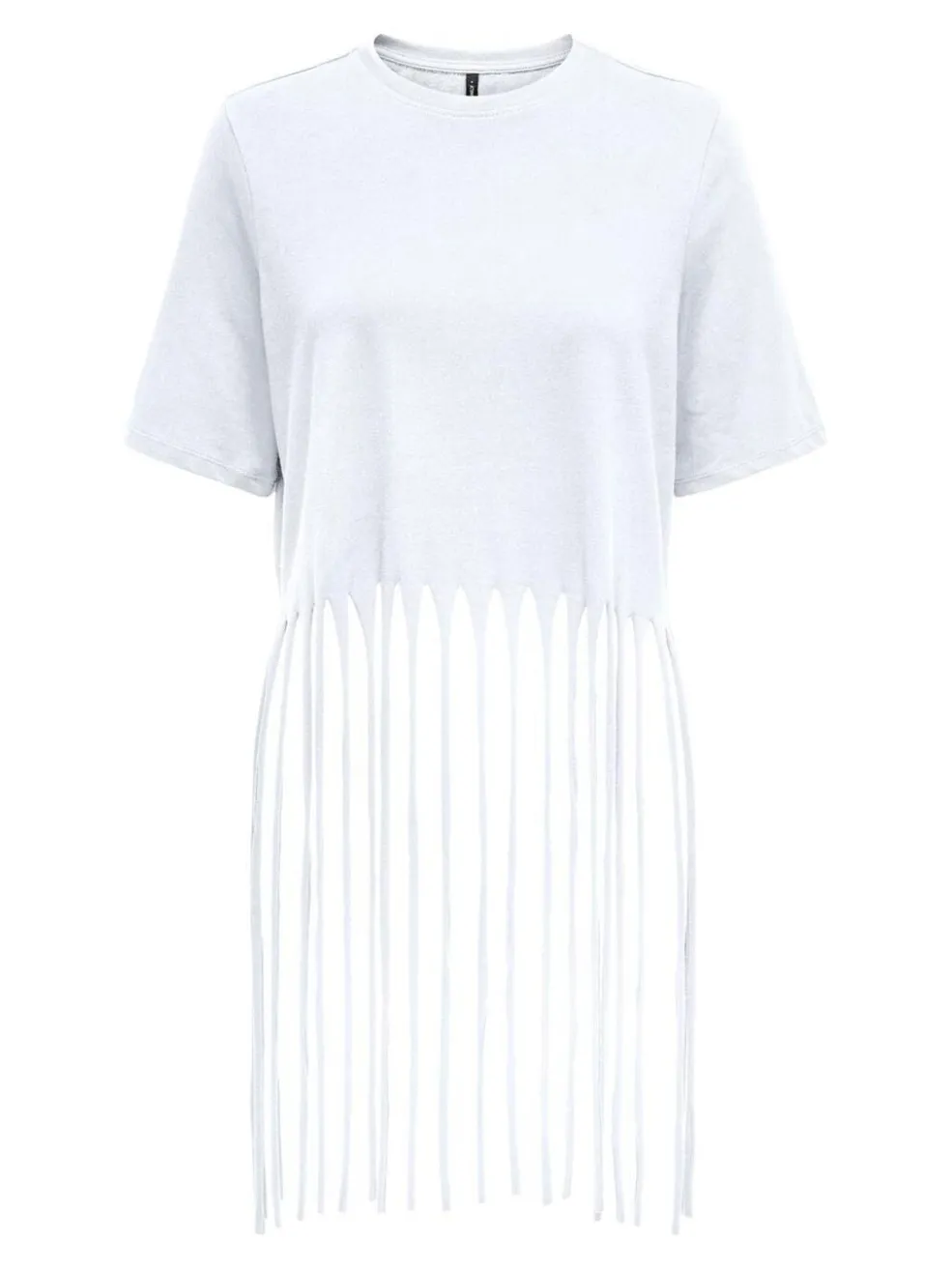 Hvid top fra Only med korte ærmer og rund halsudskæring. Den har en bred frynsekant i bunden, der går hele vejen rundt om toppen.