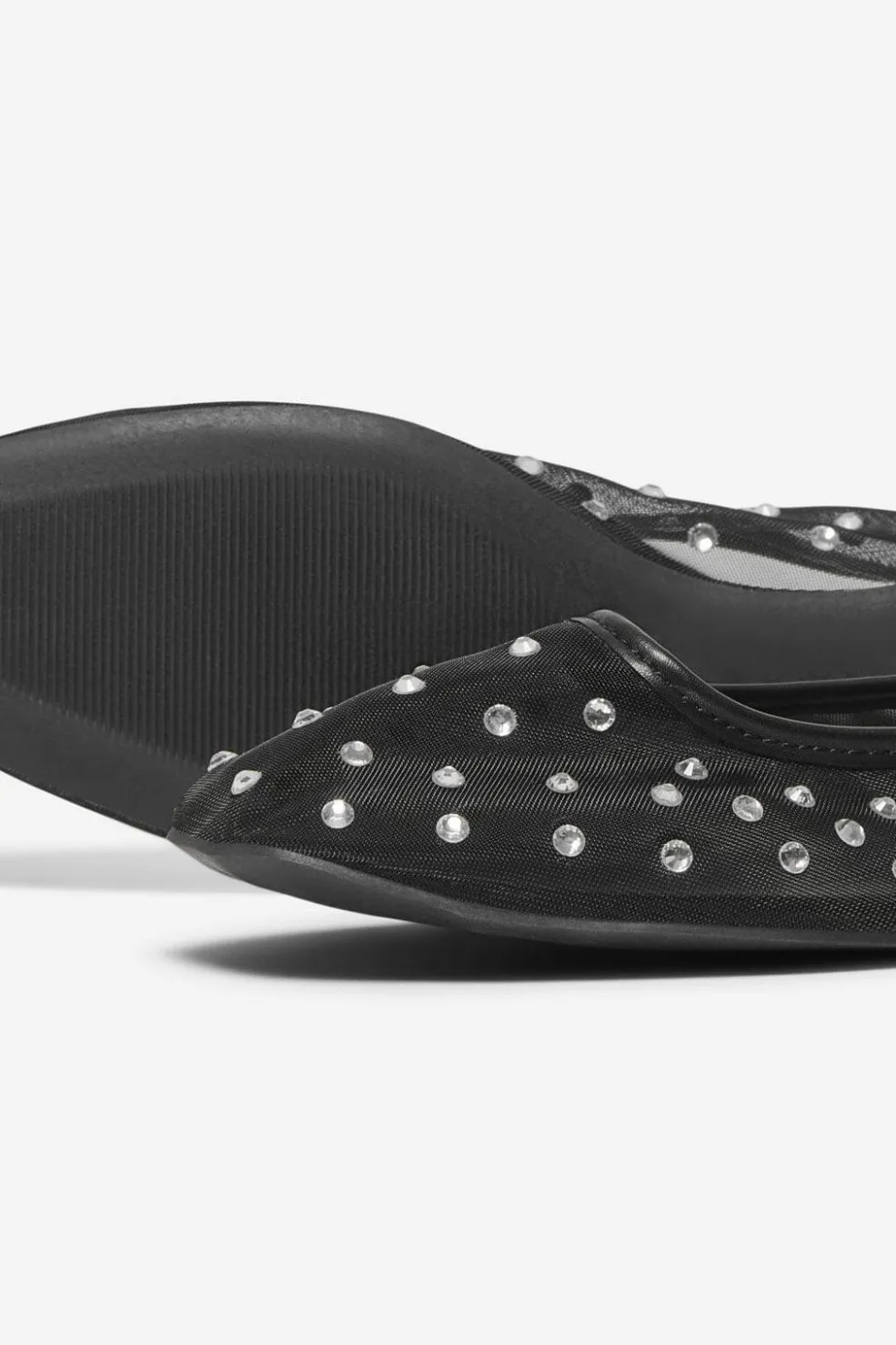 Sorte ballerinaer fra Only Shoes med transparent mesh på siderne og små skinnende nitter fordelt over skoens overflade.