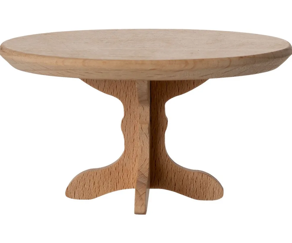 Et ovalt sofabord fra Maileg i træ til miniaturemiljøer med mus. Bordet har en central søjle med fire buede ben.