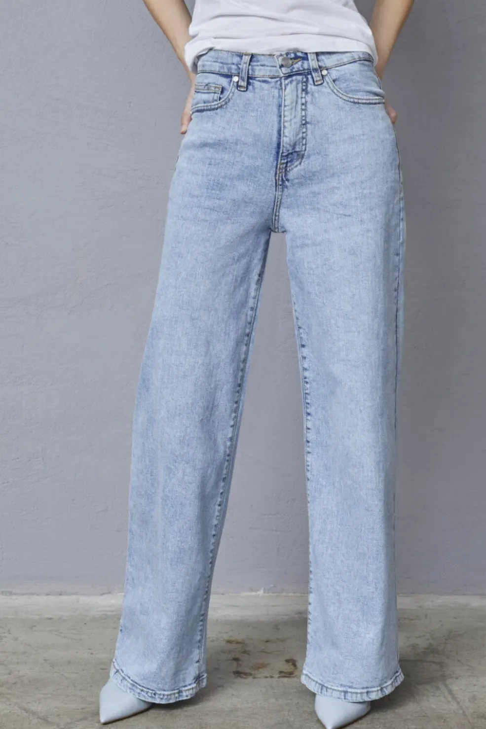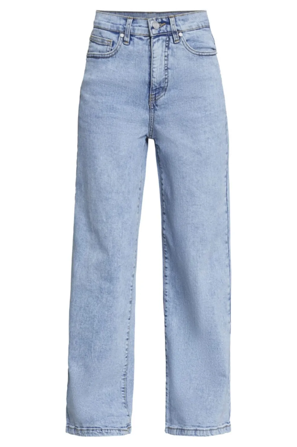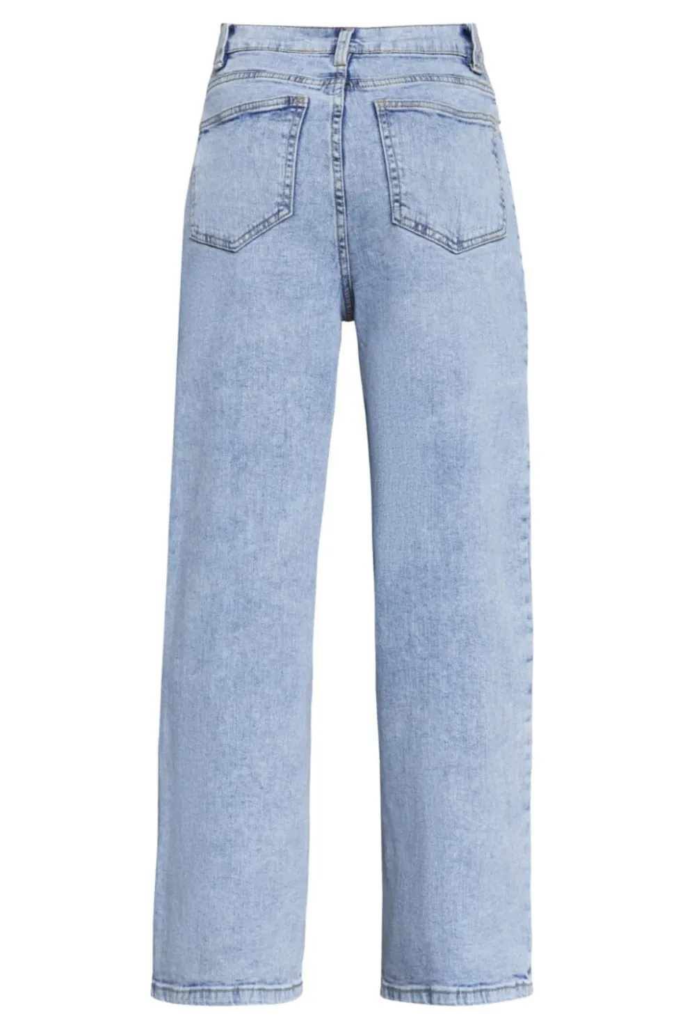 Lyseblå jeans fra Sisters Point med brede ben og høj talje. Bukserne har en løs pasform og er lavet i et behageligt denim-materiale med en lys blåvask.