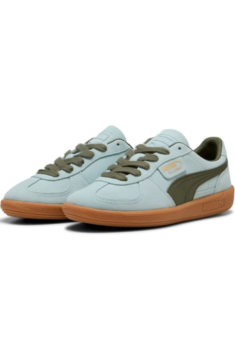 Lyseblå sneakers fra Puma med olivengrønne detaljer. Overdelen er fremstillet i læder med en robust gummisål. Skoen har et retro-inspireret design med snørebånd.