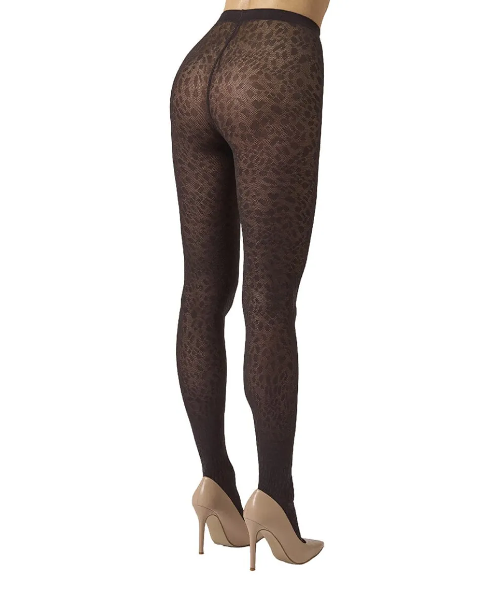Mørkebrune strømpebukser fra Wolford med dyreprint. Mønstret går over hele strømpebuksen og giver et kontrastfyldt udtryk med den mørkebrune farve.