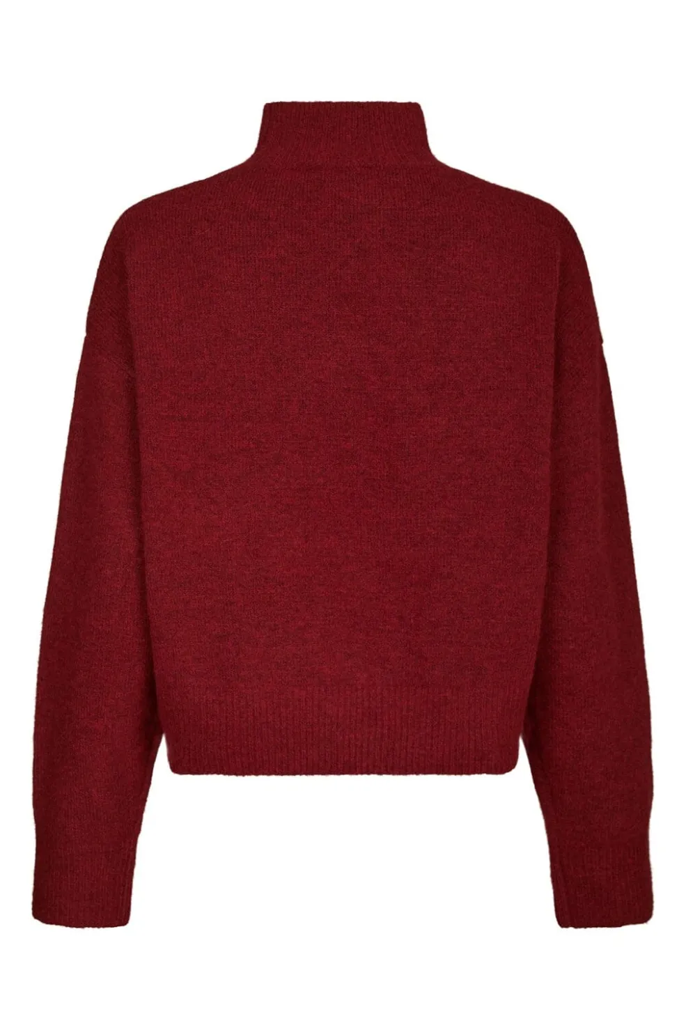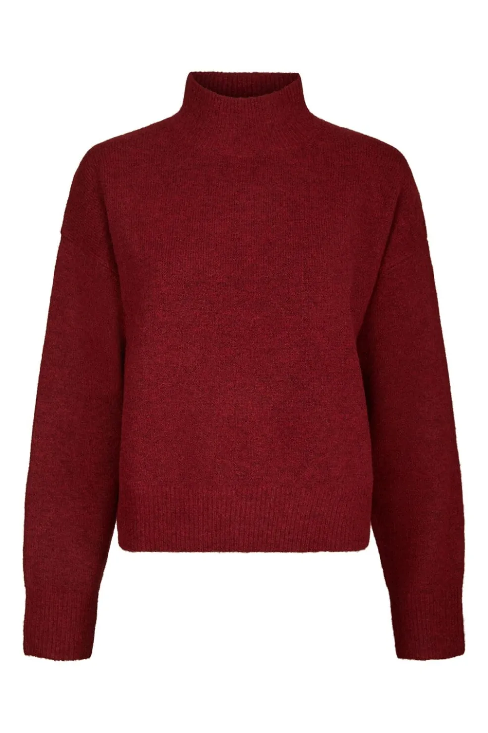 Mørkerød strikbluse fra Neo Noir med høj halsudskæring. Blusen har en løs og boxy pasform med lange ærmer og er fremstillet i en blød materialeblanding.
