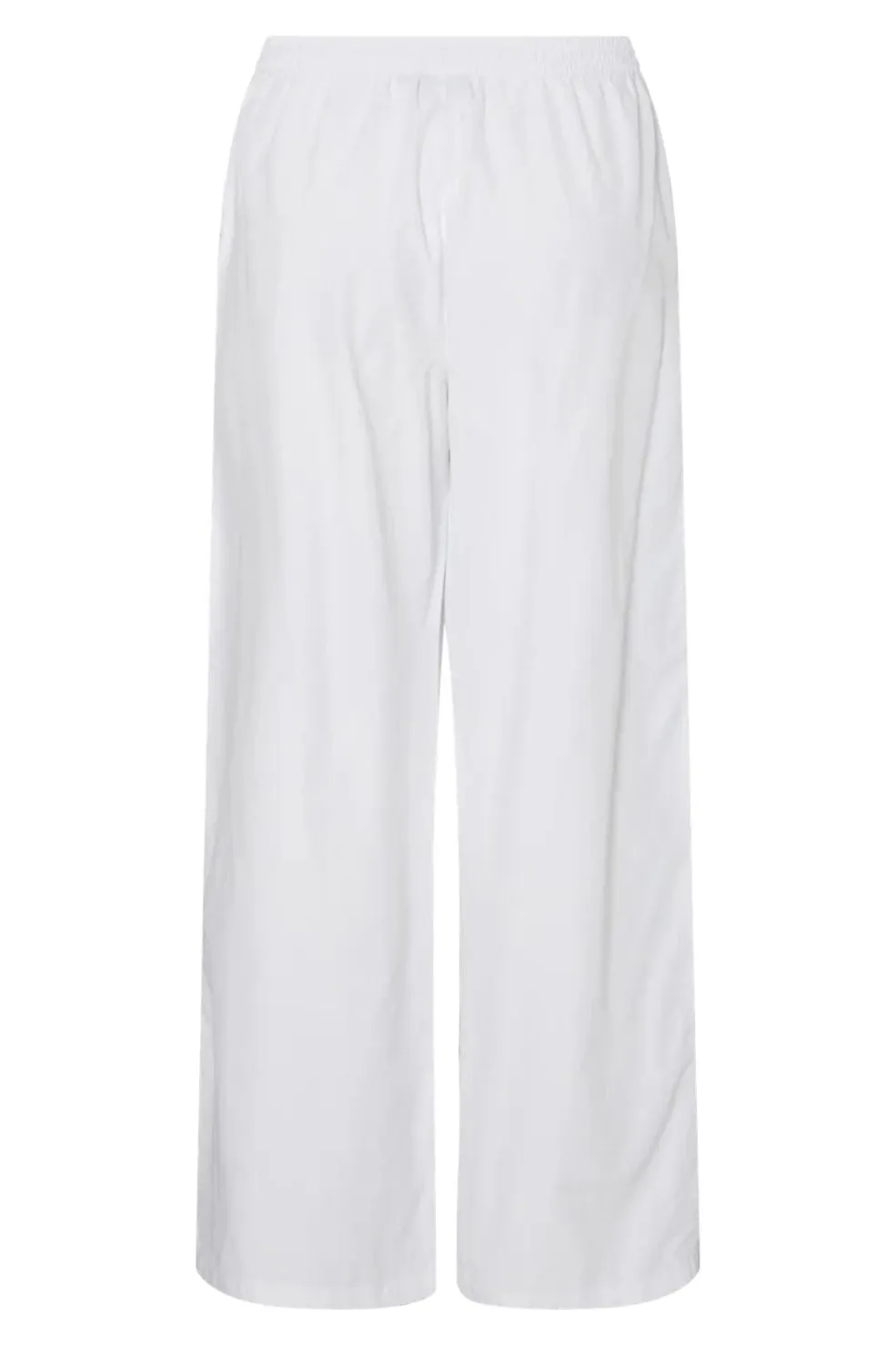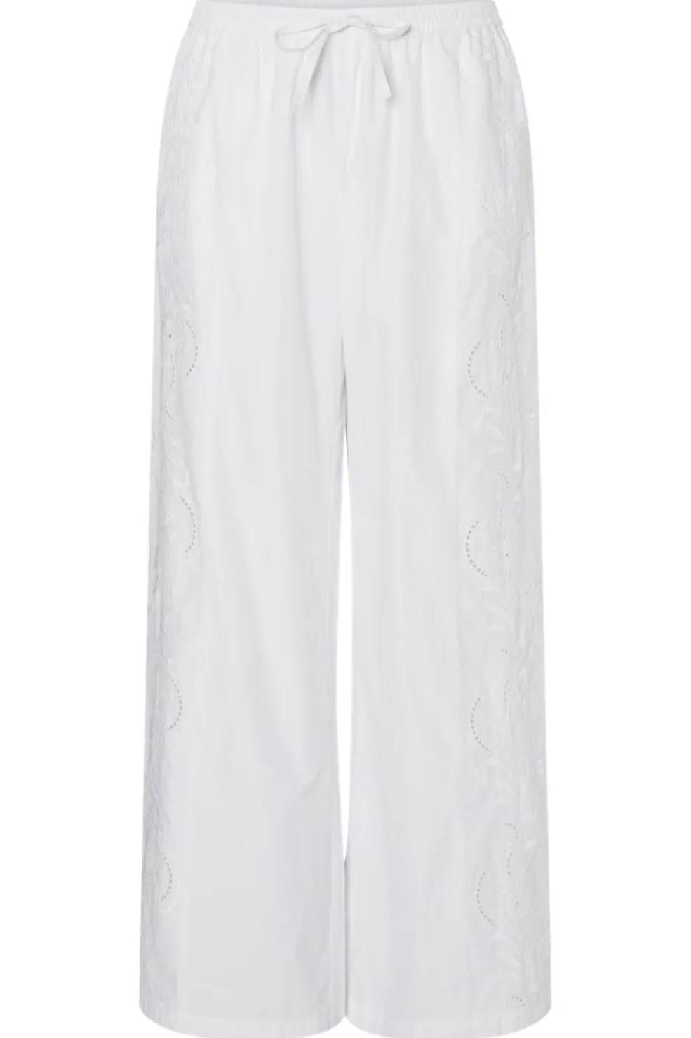 Hvide bukser fra Pieces med bred benvidde. Bukserne har broderi langs siden og en afslappet pasform med elastisk talje og bindebånd.